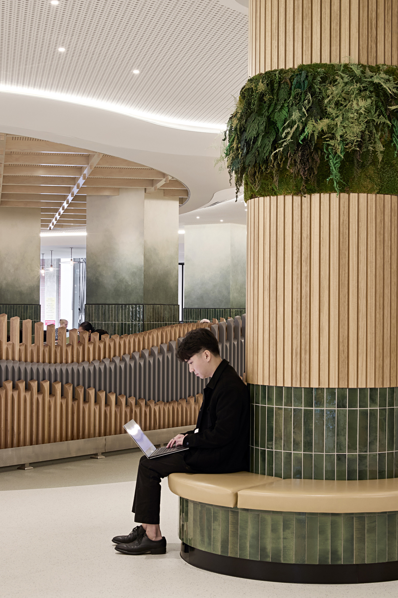 设计以创新的方式巧妙运用了有限的材料:镂空的隔音天花板可有效降低噪声,且不增加视觉厚重感;柔和的曲线和木质饰面使通行空间更具人性化。每个细节皆有其用意,既引导人们找到方向,又减轻压力,并促进情绪的恢复。