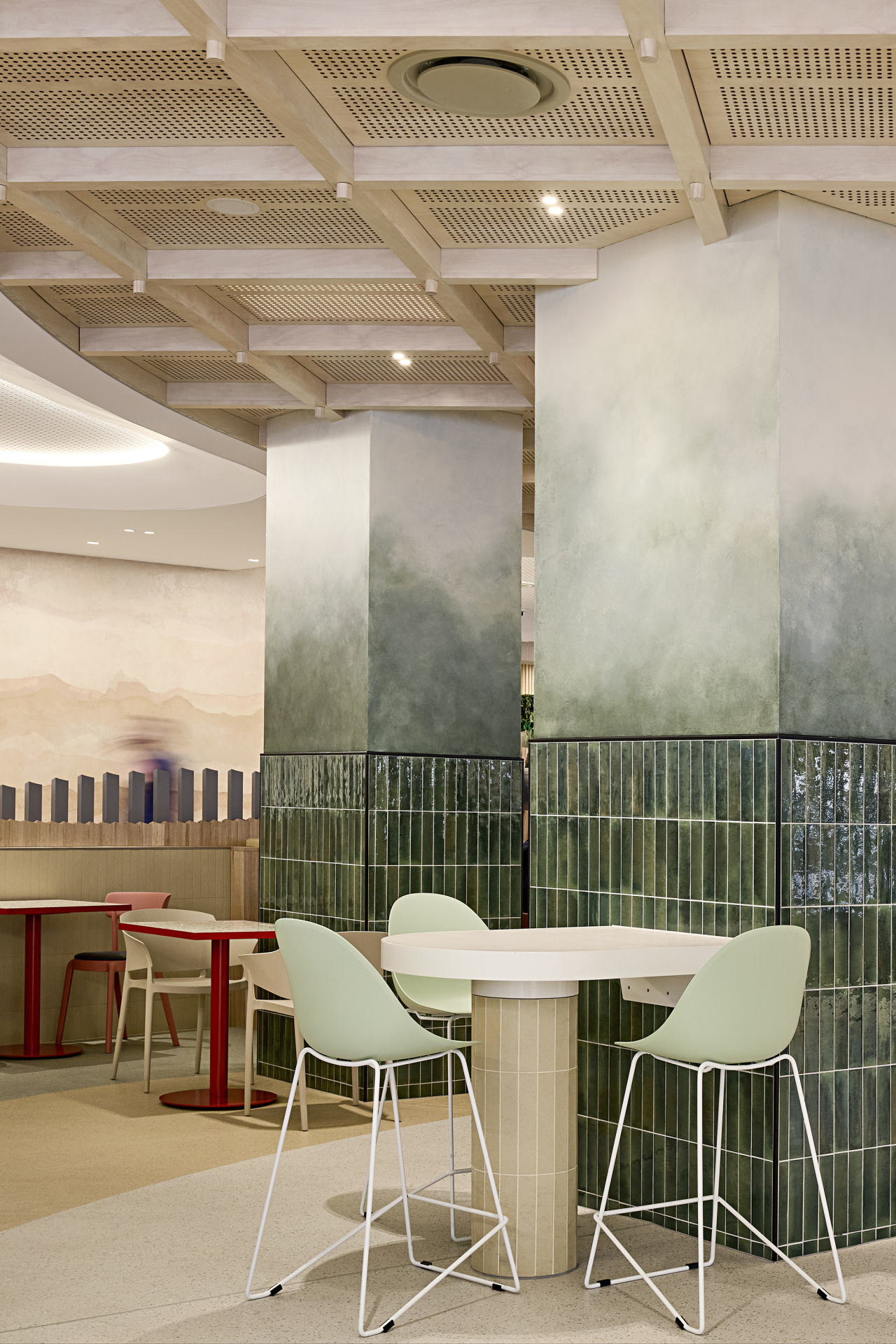 经过翻新改造的阿尔弗雷德健康餐饮区占地2000平方米,这次设计有力回应了医疗设计中常被忽视的挑战:如何在通常注重功能性的空间中营造温暖、流畅与尊严的氛围。设计将该区域重新构想为三个相互连接的区域:“跳动的心脏”“阳光房”与“村落”——每个区域都旨在帮助人们恢复方向感、引入自然光线并营造轻松氛围。