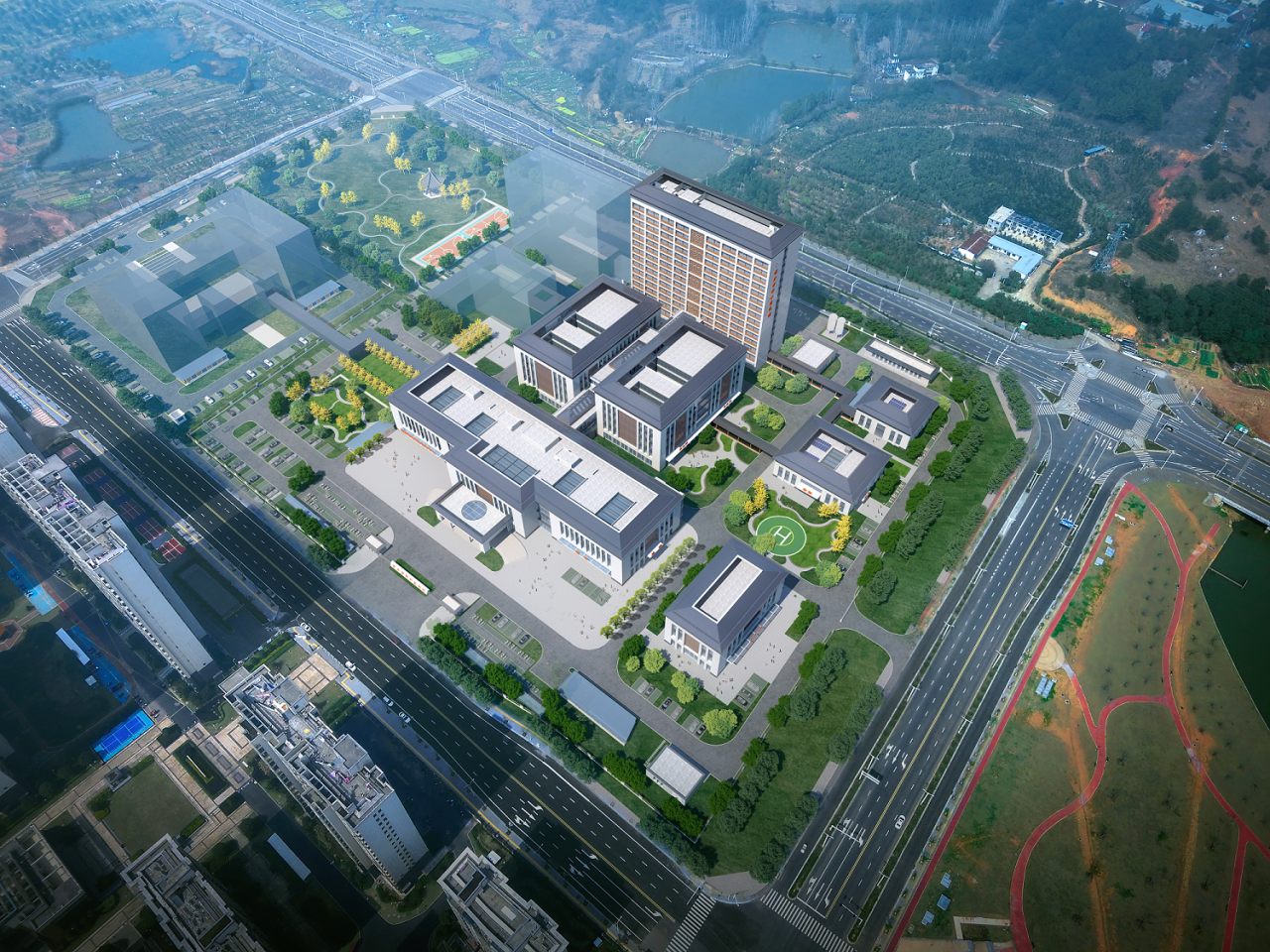 医院整体规划根植于东方智慧,将传统园林的意境与中医养生哲学融为一体。布局上借鉴古典园林的起承转合,形成层次丰富、内外交融的院落体系,暗合“苑藏园、园含院”的共生秩序。空间组织注重虚实相生、阴阳互济,通过建筑体量的错落、廊院的穿插以及景观的渗透,构建出藏风聚气、动静平衡的环境格局,深刻呼应了中医文化中“天人相应、身心和合”的核心精神。