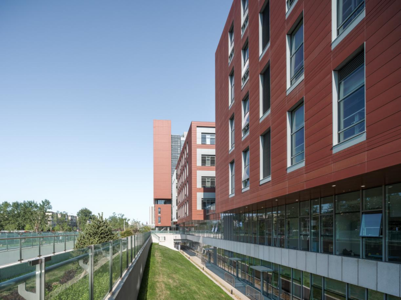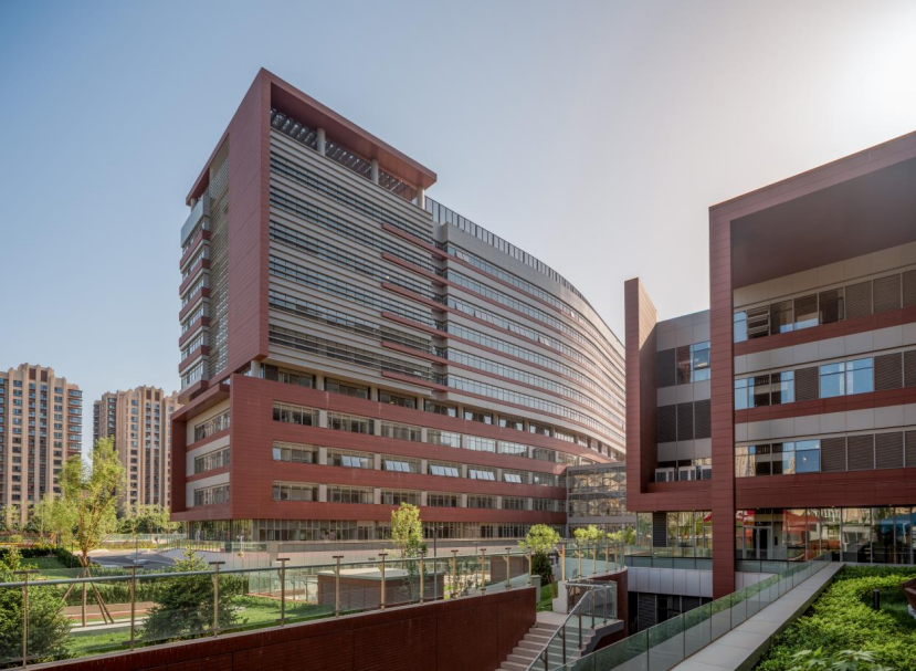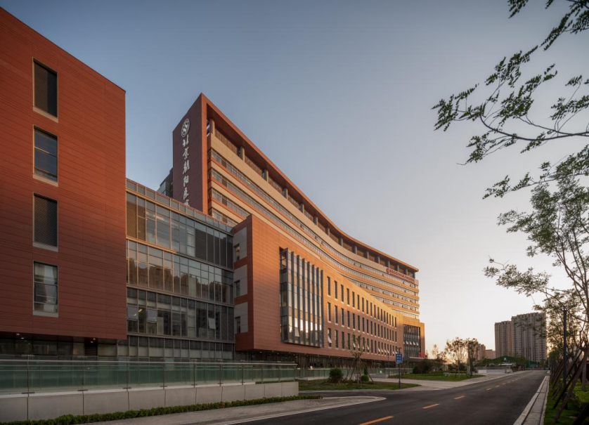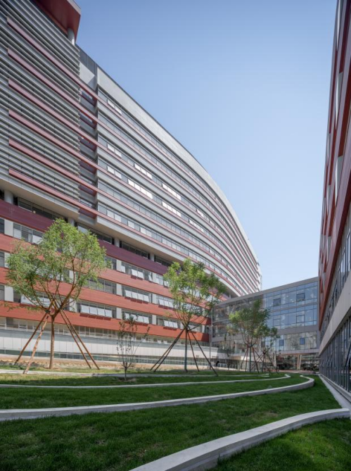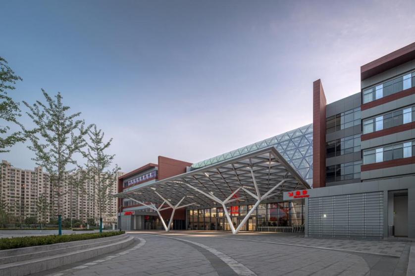 项目南北两侧为居住小区,东侧为城市体育公园,西侧为体育设施用地。基地处于开发成熟的城市街区,四面环路,地铁、公交车站等公共交通发达。项目设计达到国家绿色建筑三星级标准,是北京市第一批整体钢结构装配式建造的医院建筑,装配率达72%。