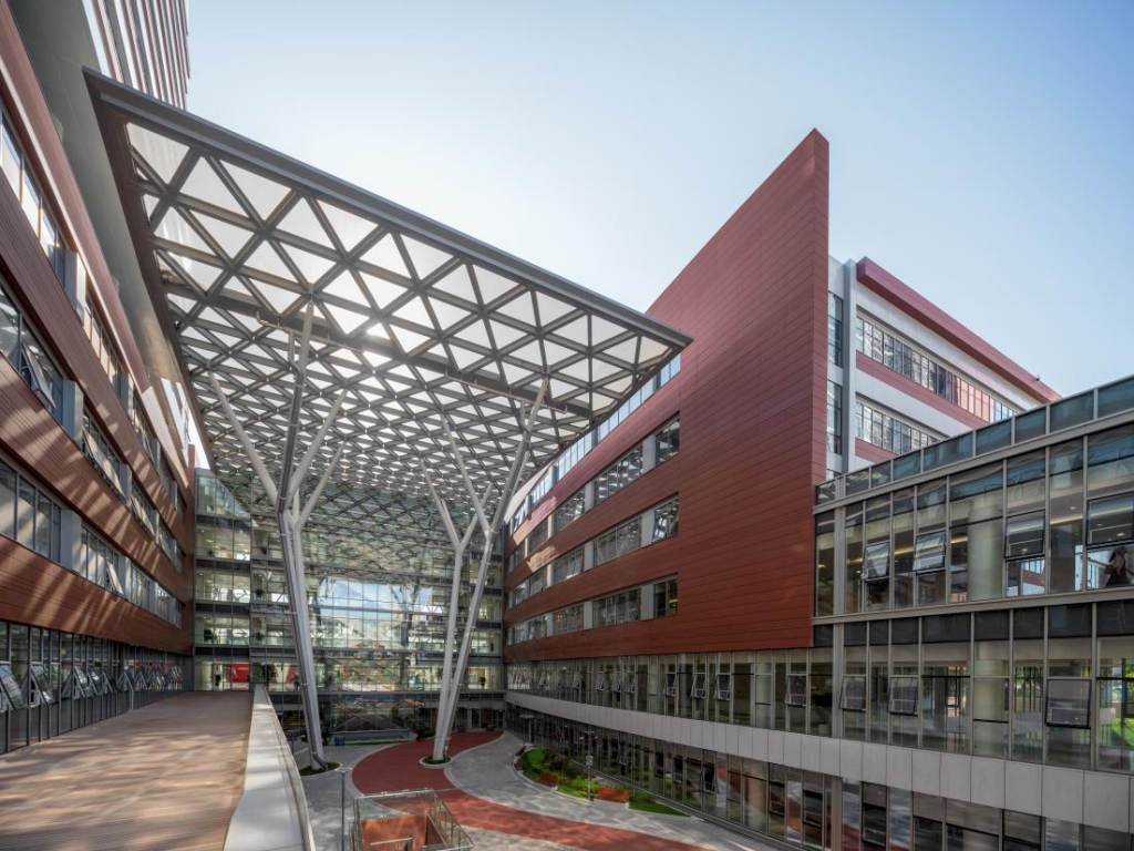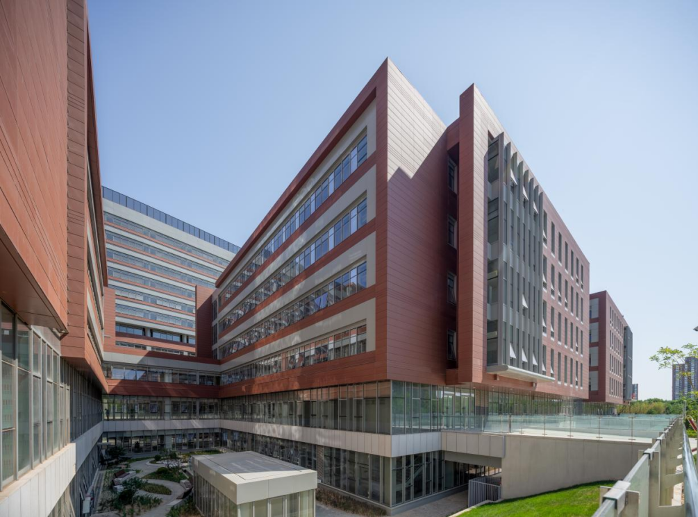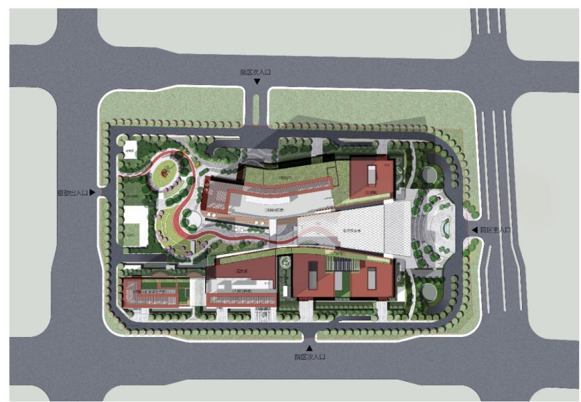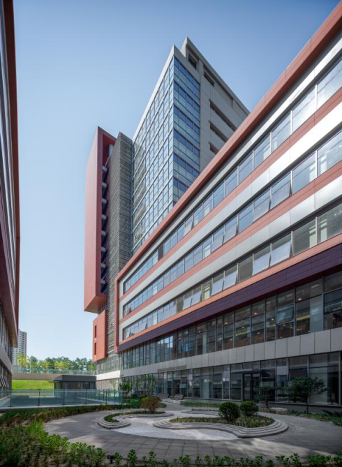 建筑立面与屋顶整体设计,采用红色陶板+灰色铝板,韵律的横向带状线条,山墙面及高层与裙楼的体量变化,进一步从色彩和质感上呼应医院传统文化及“丹凤朝阳”的主题。