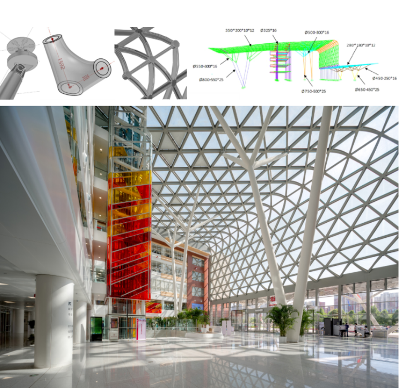 生态谷中部轻盈的单层铝合金网格结构大飘蓬,由8棵钢结构树形柱支撑,将门诊大厅包裹其中,形成室外(入口广场)→ 室内(门诊大厅)→ 室外(下沉广场)的空间序列和视觉通廊,步行其中产生独特而难忘的空间感受。