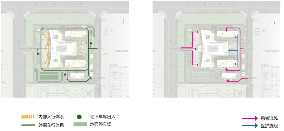 院区在西、东侧均设有车行出入口,分别对应主体医疗区、住院出入口、污物出入口。进入院区的车辆直接驶入地下,并在地下室设置落客区,通过楼梯、电梯可便捷到达各诊疗区,停车以地下停车为主。