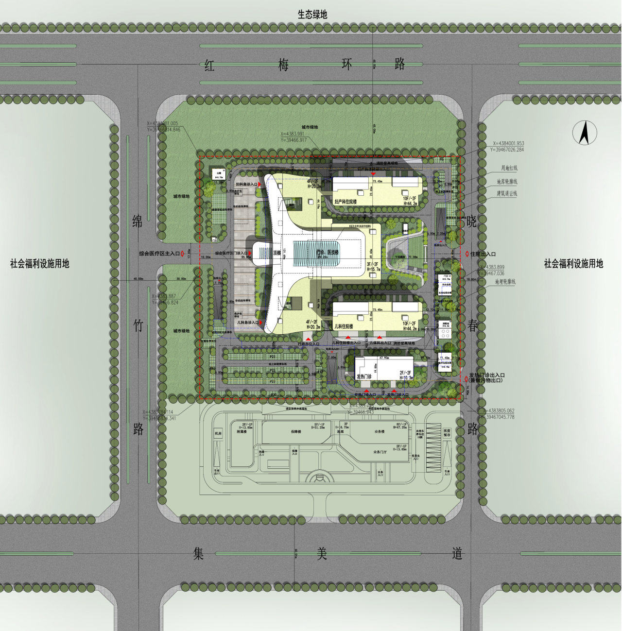 主体医疗区位于基地北侧,主入口迎向城市方向,展示院区整体形象,方便就诊人流。