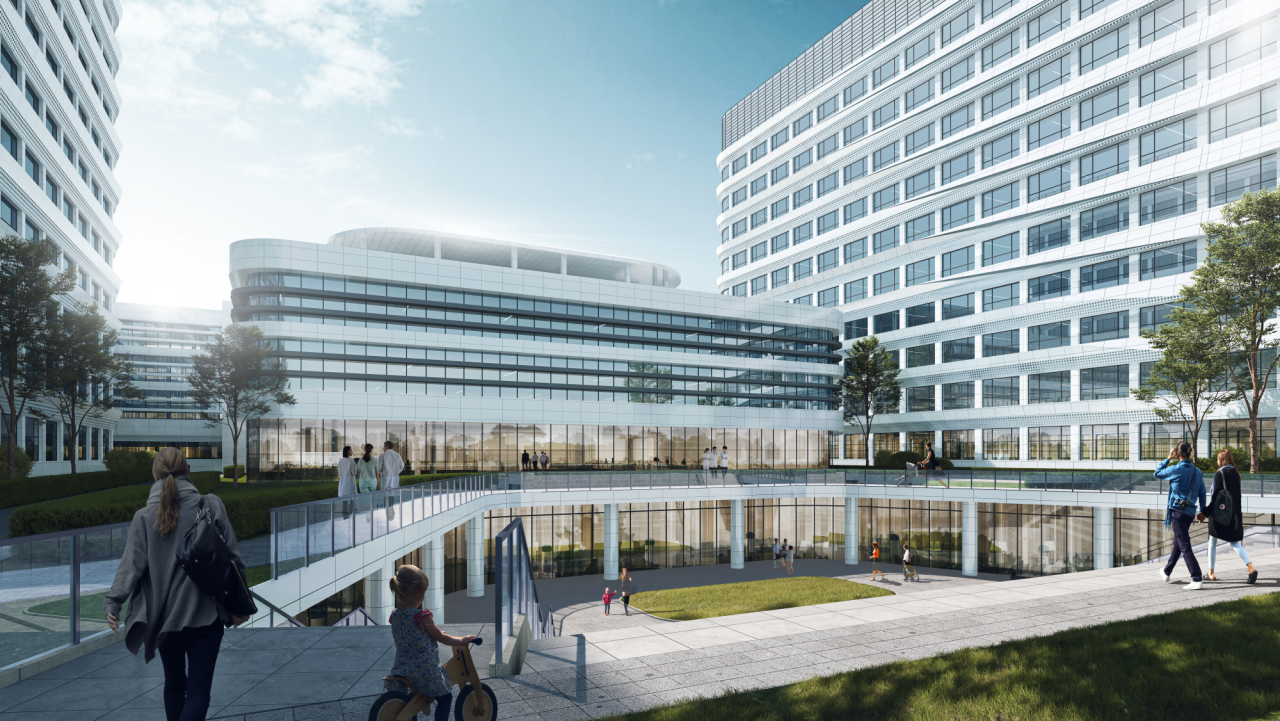 一心:院区共享的中心景观,位于两住院楼中间,是医院的绿肺,为患者提供室外疗愈场所。
