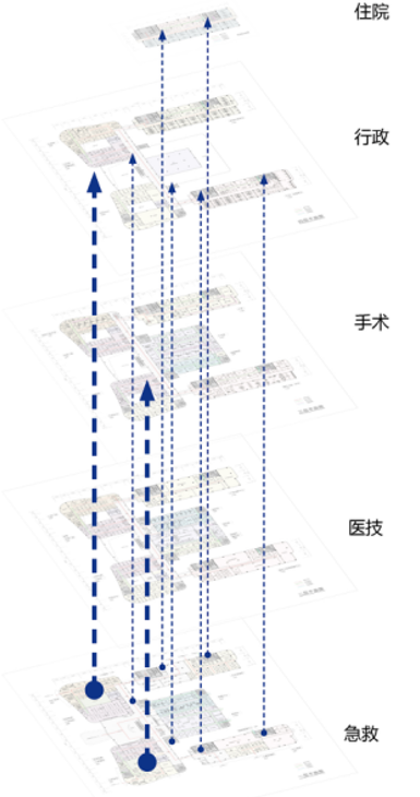 交通组织是支撑医疗综合体功能的重要子系统,流线的设计引导患者高效完成诊疗流程, 将具有入院需求的交通流分类型、分区域导入院区,人车由入院起逐次完成功能内容后顺畅离开医院或停留在指定位置。