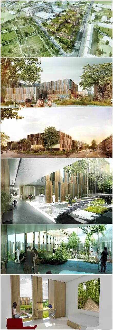 Henning Larsen Architects事务所的设计师坚信自然景色有治愈作用,所以在他们为丹麦Herlev医院扩建项目的设计中包含了绿色房顶,花园和茂盛的中心绿色带。