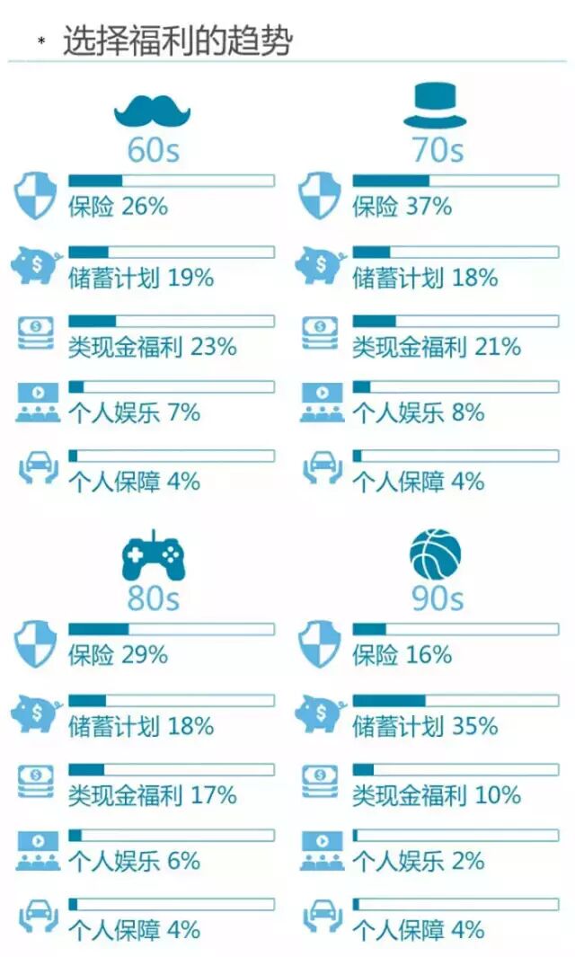 弹性福利这种由员工在福利菜单中选择适合自己福利的模式在很大程度上解决了企业成本管理和员工满意度的矛盾。生活在一线的年轻女性员工更乐于为自己制定符合自身特点的福利结构。另外,有78%的员工愿意选择报销、卡券、节日礼金等类现金类福利。但数据显示2014年最佳平衡工作生活的福利是旅游、教育、健身、电影、旅行保险。根据年龄的不同所选福利的重心也各不相同。70后员工对保险的重视度高,90后对保险的关注度最低,这一年龄群更加重视储蓄计划。80后对保险、储蓄计划和类现金福利的追求比较平均。