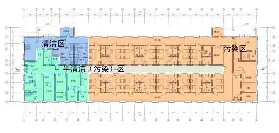 传染病医院应严格按照清洁区、缓冲区、污染区的三区原则进行平面空间划分,清洁区与污染区之间必须设立缓冲区,各区使用房间均独立设置,不可共用。当医务人员由清洁区进出污染区,康复病人由污染区进入清洁区时, 必须经由缓冲区内进行多重更衣与消毒,而各分区在竖向空间也应尽量对位,以保证交通路线的独立连贯。