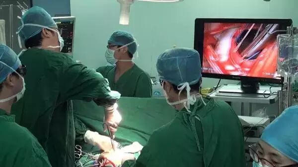 这是一台治疗心脏瓣膜病的胸腔镜下瓣膜成形术,传统瓣膜成形手术是在全身麻醉的情况下操作,完全劈开胸骨,切口长20cm左右。完全胸腔镜下瓣膜成形及置换手术,这种疗法在胸壁仅有三个1.5厘米左右的钥匙孔样小孔进行手术,多数患者胸廓稳定性不会遭到破坏,且减轻或免除体外循环给患者带来的创伤,而且美观。主刀医生熟练、准确地进行着这台手术,整个过程如行云流水般,手术圆满完成。