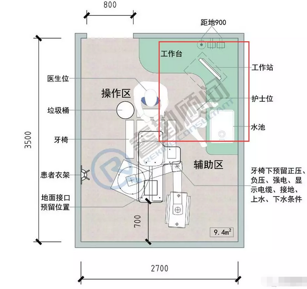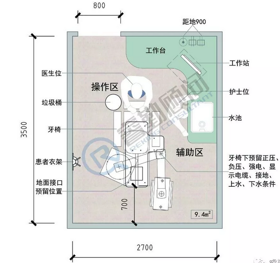 对于大空间诊室,可用半开放隔断区间,每椅中距不应小于1.8米,椅中心距墙不应小于1.2米。每个隔断区均应配备水池。
