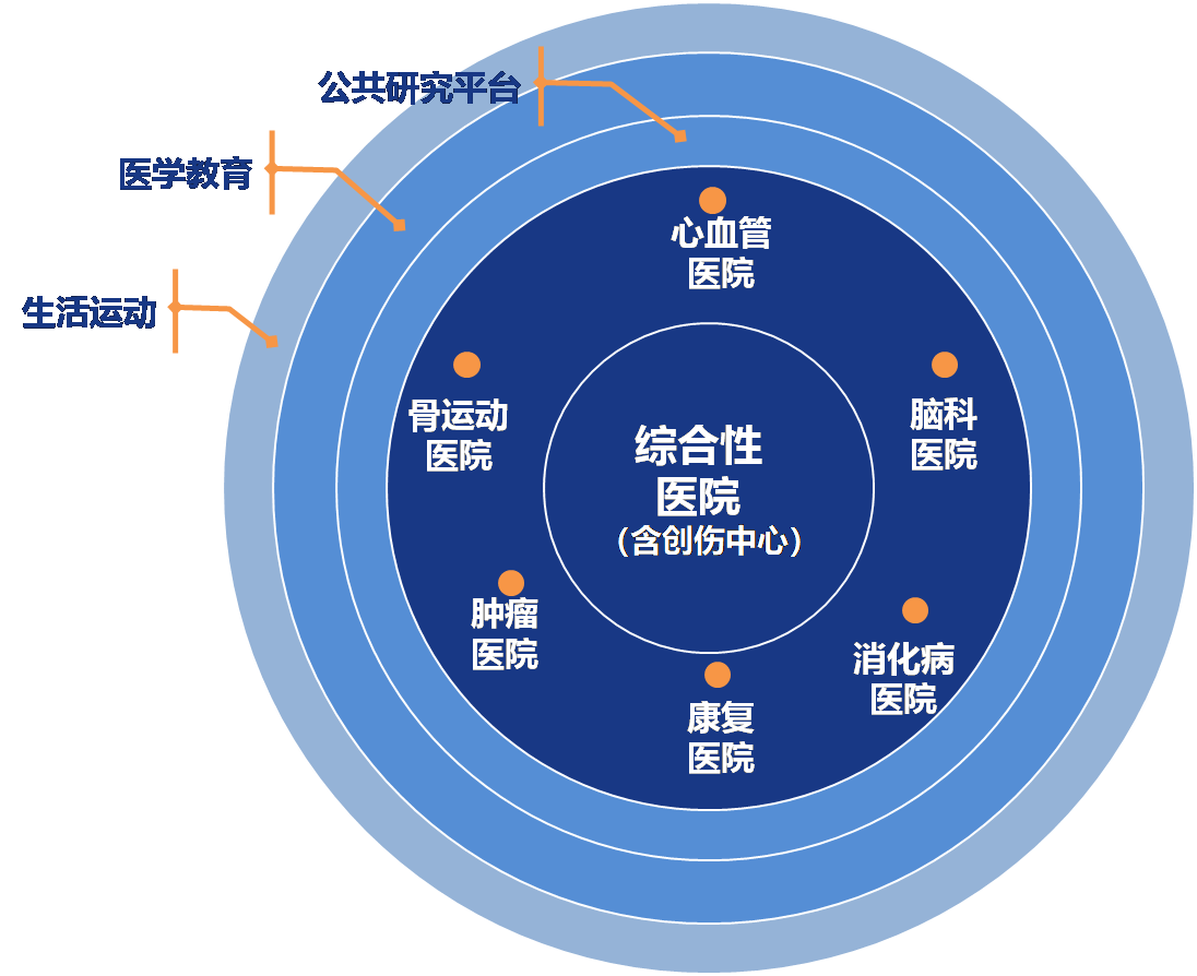 新院区将实行“大综合+大专科”的模式,以价值医学理念为导向,为患者提供最优质、最精准、最人性化的医疗服务:综合服务全覆盖,实现“高效有序整合”,打造综合创伤中心,拟建设智能化病房、一站式日间手术中心、全球联通的网络医学中心等;专科服务以学科群为导向,建设心血管病医院、脑科医院、肿瘤医院、骨运动医院、康复医院以及消化病院等六大“专科医院”。