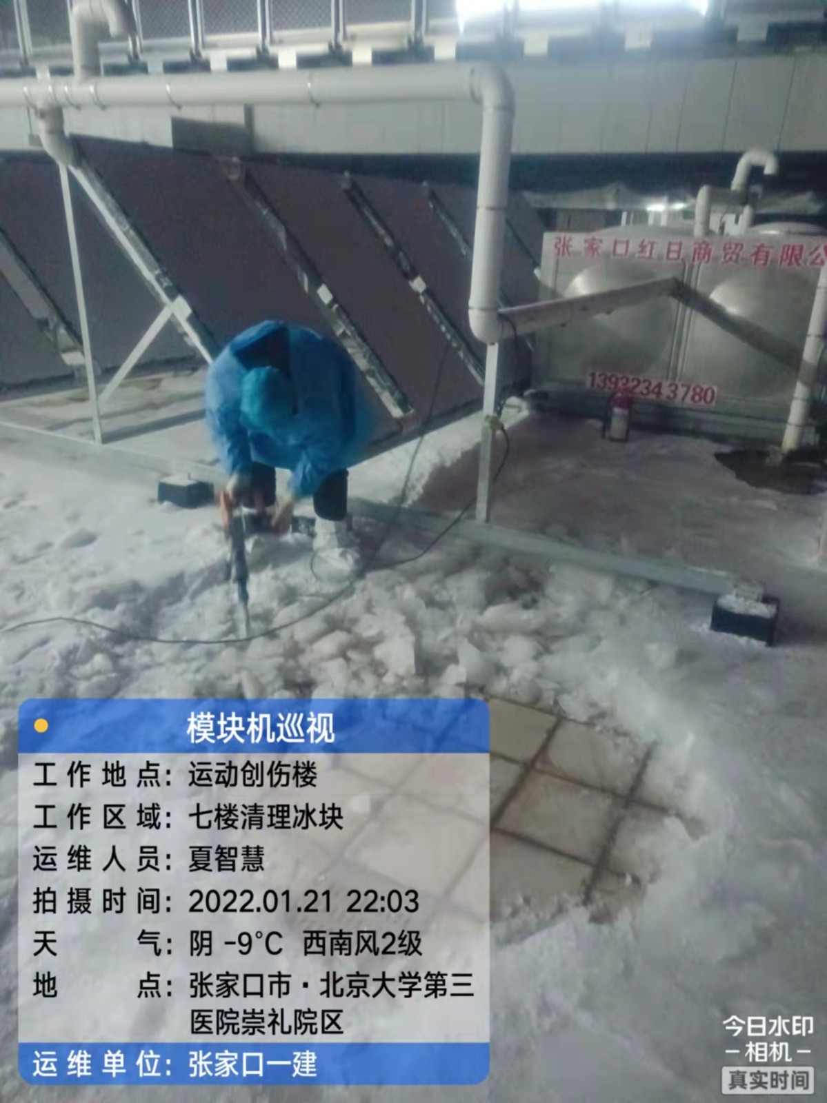比如有一次医院的室外水管被冻破了,气动物流工程师发现后立即通知了我们保障组,没等我们到现场他就率先跑过去关阀门排水,到达现场后水管里的水已经被控制住了,我们走进冰冷的水里进行快速抢修,很多人的鞋子裤子甚至衣服都湿了,大家没有惧怕崇礼动辄零下二十多度的气温,队伍中的一员边修理边喊出了我们的口号:“不畏辛苦不畏寒冷!”口号让我们工作起来更有动力,设备也很快抢修完毕。