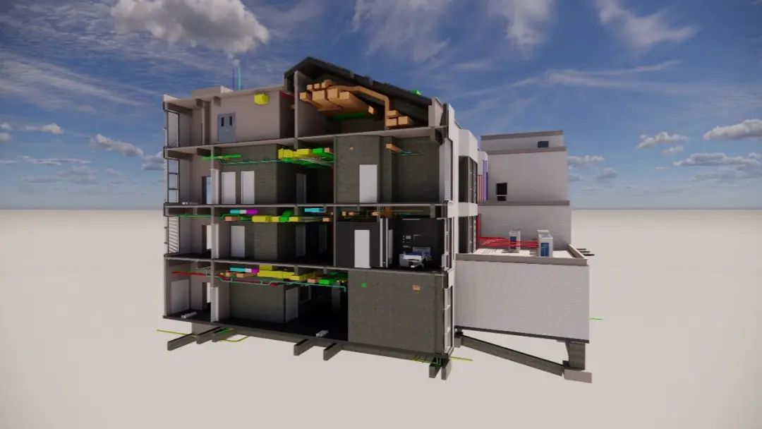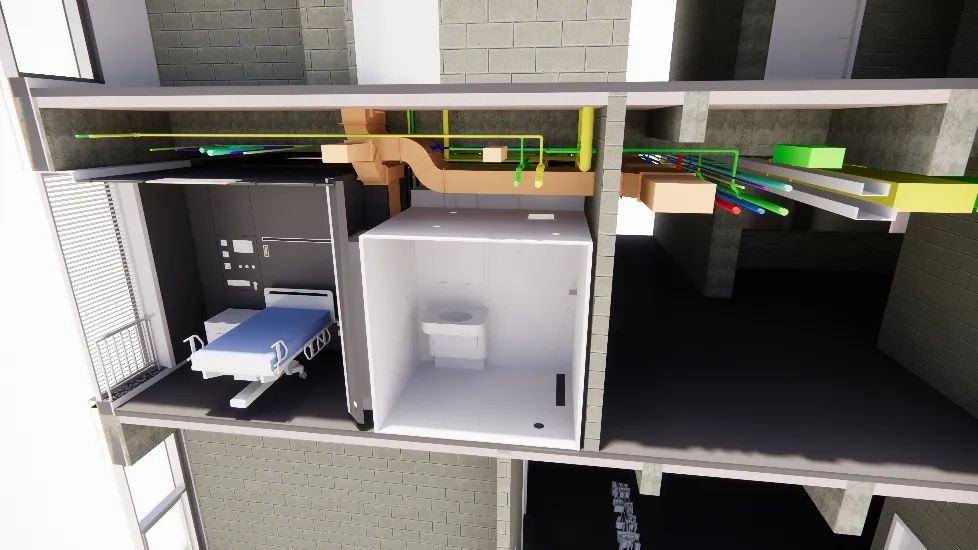 本项目采用了装配式病房和卫生间,基于BIM技术云端协同设计,让远在广东的厂家深化设计,基于同一个文件开展,相关建筑结构机电基础信息精准唯一,向上关联建筑各专业相互协调,向下打通与工厂生产加工数据。