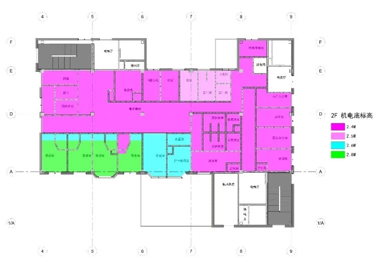 02 | 功能复杂,医院建筑是民用建筑中较为复杂的建筑类型,而本项目为改造建筑,平面限制因素多,既有结构层高的限制是重难点。F2层结构梁底标高2.82m,需要满足机电安装空间,并保证高度满足使用要求。 |