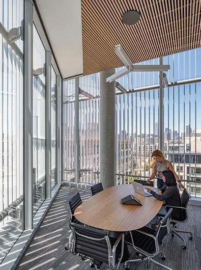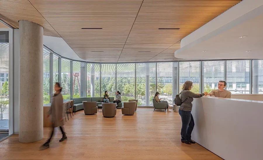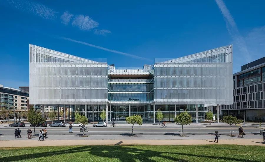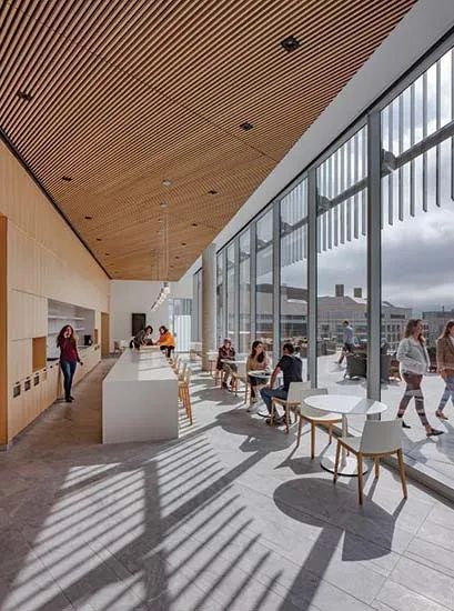 百叶的设计使用了虚拟现实模拟以及四分之一比例和全尺寸模型,需要解决使命湾阳光和风的问题,附加在幕墙结构上,并投影到距离玻璃足够远的地方,以便让窗户视线清晰。作为一个额外的好处,这种投影给大学规定的75平方英尺周边办公室的居住者留下了拥有更大空间的印象。MCA高级合伙人保罗•戴维森解释说,这些通常与共享空间相吻合,比如等候区和开放式办公室,这些地方没有靠近玻璃的座位。他补充说,从环境上看,这些开口与邻近建筑的飘窗相呼应,有助于软化建筑的体量,同时让行人可以看到建筑内部。研究表明,相邻的布道厅将有助于保护南立面免受热量增加和眩光的影响,“人们对更大的开口感到舒适,允许更多的日光进入,并允许更大的透明度,”他说。