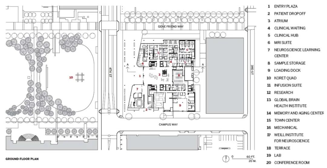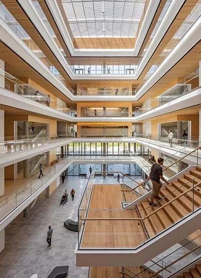 走进这里,人们首先注意到的是光线:一个带天窗、六层楼高的中央中庭,沐浴着阳光的患者治疗室,一排排采光良好的实验室长凳,以及一个面向日落的宽阔屋顶露台。位于加州大学旧金山分校使命湾(Mission Bay)校区的琼和桑福德·艾·威尔(Joan and Sanford I. Weill)神经科学大楼占地28.3万平方英尺,即使以加州的标准来看,它对光线的追求也是疯狂的。对于这个融合了神经科学和精神病学的研究和治疗的非典型设施,史密斯设计集团(SmithGroup)和马克·卡瓦涅罗联合设计公司(Mark Cavagnero Associates (MCA))设计采取了一种非常规的方法,无视无菌的机构先例,转而支持更自然的环境。设计建筑师马克·卡瓦格内罗(Mark Cavagnero)说:“我试图用光来设计,而不是用钢或混凝土,其他一切都是次要的。”