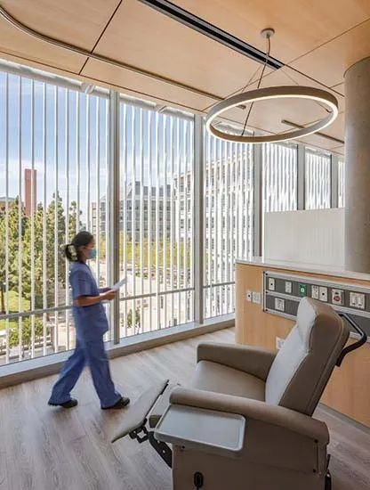 日光是卡瓦格内罗将结构组织成双向平板结构的的主要原因。主要的西侧入口面对着加州大学旧金山分校中心的Koret Quad公园。在MCA团队的鼓励下,公园东侧入口对面的一排茂密的树木被移除,让建筑师能够利用更多的阳光和庭院的景观。他们在建筑的西端建立了开放的露台、社交空间、候诊室和输液室——患者可以在这里接受几个小时的治疗——并将工作空间设在建筑的南北玻璃区域。东侧覆盖着金属板,有几扇小窗户,面对着停车场,旁边是Snøhetta设计的Chase Center竞技场,容纳了机械室、流通和其他不太依赖自然光线的空间。