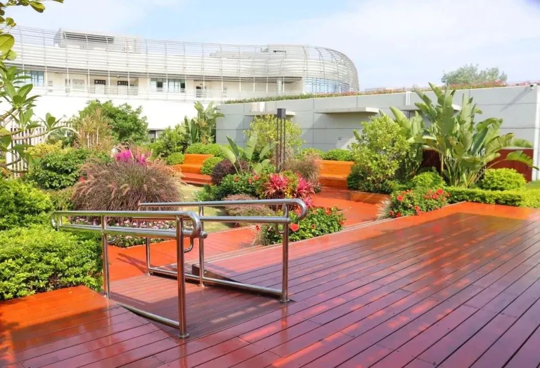 医院造型独特现代,银灰色外立面高雅大气。院内有良好的采光和自然通风条件,精心搭配的空间色调、建筑材料及软装。医院配置有咖啡屋、自助咖啡机、24小时便利店,医院飘的咖啡香味能够有效舒缓患者心情。院内标识采用双语设计,清晰准确,吊牌、立牌、地面引导类型齐全。并且医院设计有三个空中花园,WiFi、饮品、轻音乐、绿植应有尽有,做轮椅的病人也可便捷进入。这样的设计让医院空间的安全性和舒适性大大提高。