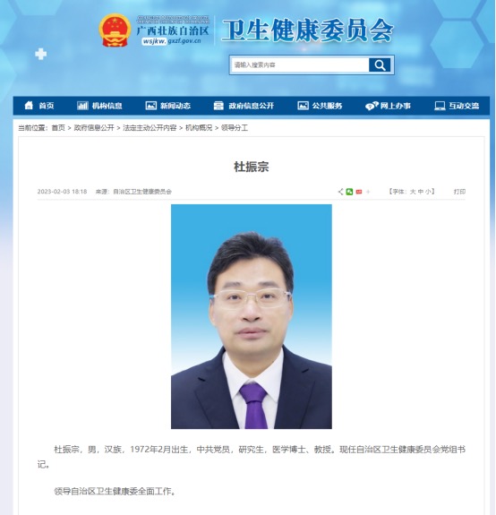 据广西壮族自治区卫生健康委员会官方网站“领导分工”页面更新显示,杜振宗已任广西壮族自治区卫生健康委员会党组书记,廖品琥不再担任。