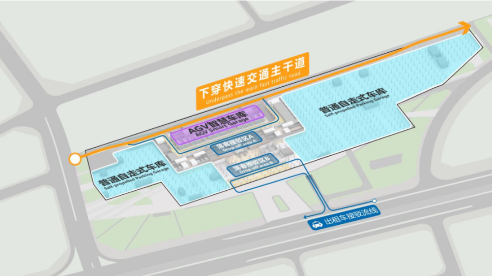 沿场地西侧构建下穿交通主干道,采用单向通行原则,并联各常规停车区、AGV智慧车库和分区落客接驳平台,快速疏解各类地下车流,构建枢纽化医院交通组织模式。
