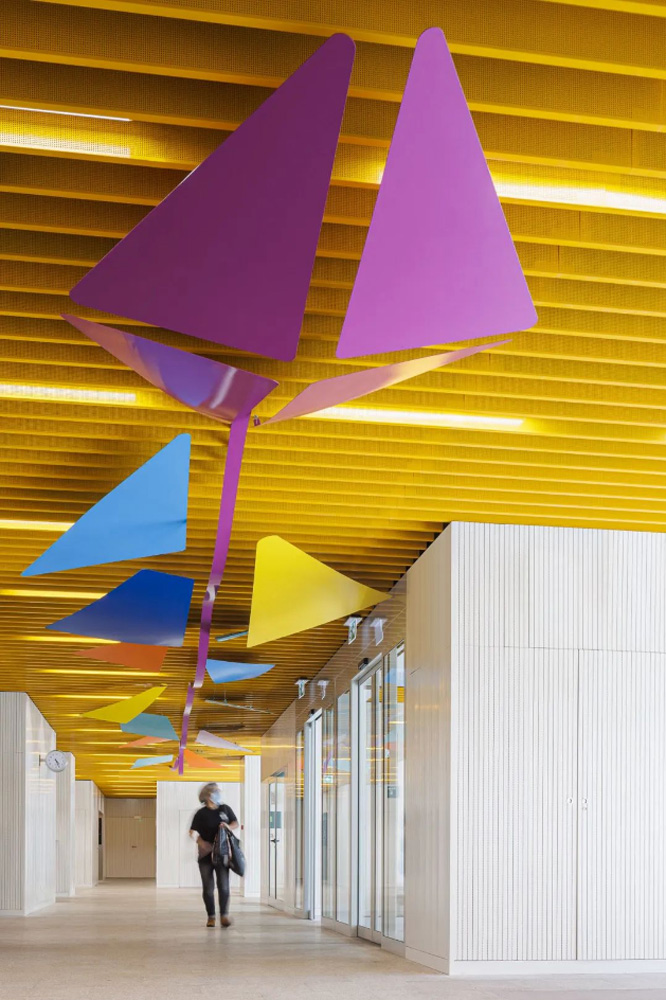 考虑到病区面对的群体是儿童,设计师为空间确定了多彩的基调,进而明确了插画的主角元素——风筝。风筝从画中“飞出”,化身一个巨大的彩色装置,装点着病区入口的走廊天花,简单的形状组合在亮黄色天花的映衬下变得生动起来。