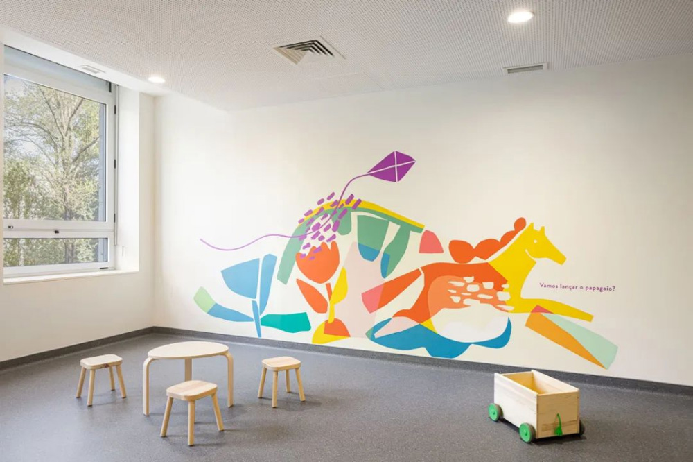 Francisca Ramalho的插画讲述的是沿着病区的风筝之旅。在行走路线中,墙上不同的插画完整地描绘了一条充满神秘植物和隐藏动物的视觉景观道路,梦幻般的色彩刺激着视觉的感官,具有故事性的表现形式可以让儿童在欣赏的时候激发想象和思考。病房是一个包容很多情绪的空间,设计师希望在这个彩色的世界里能够让那些正在经历伤痛的患者短暂的逃离现实,让身心感受到疗愈与温暖。