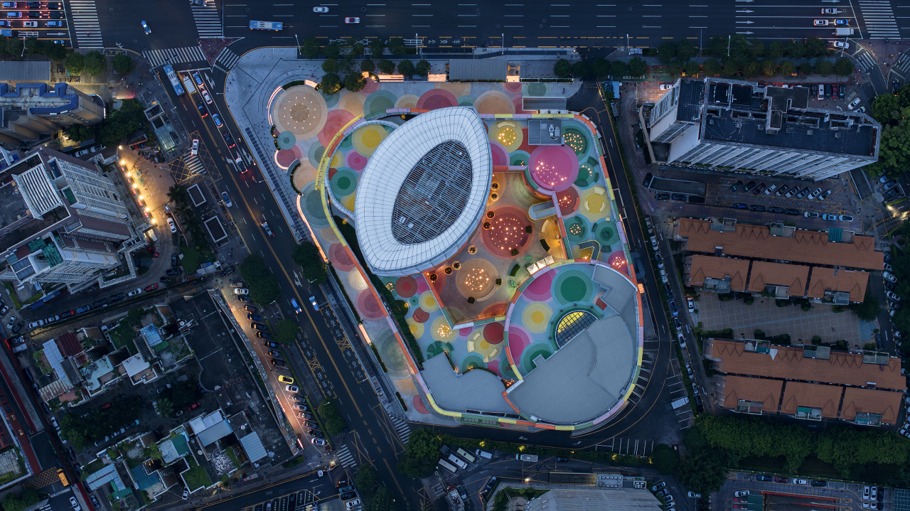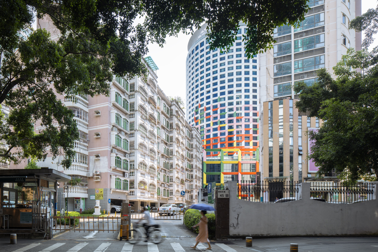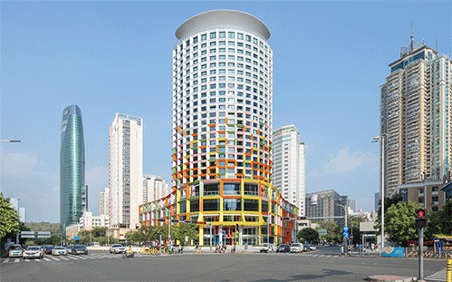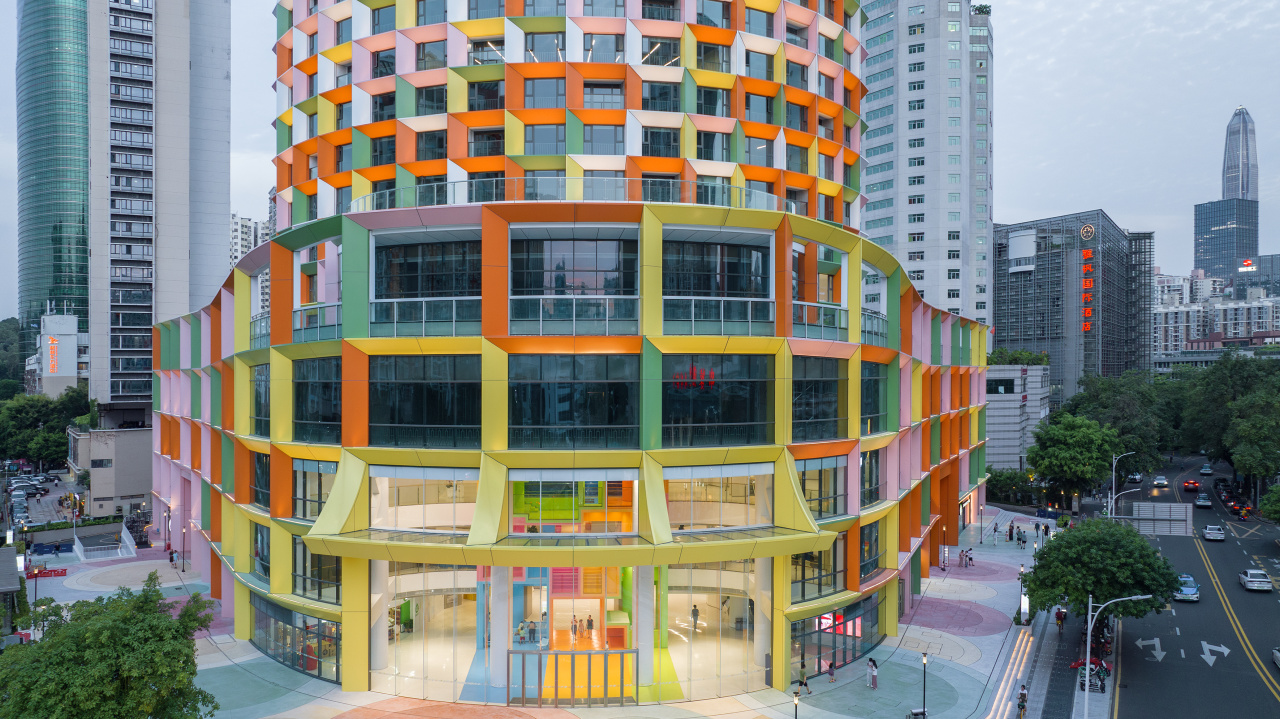 建筑以其色彩绚烂的外观,为深圳福田区带来耳目一新的地标。更重要的是,这座100米高的改造项目为深圳正在兴起的“适应性再利用”城市更新风潮树立了重要的典范。
