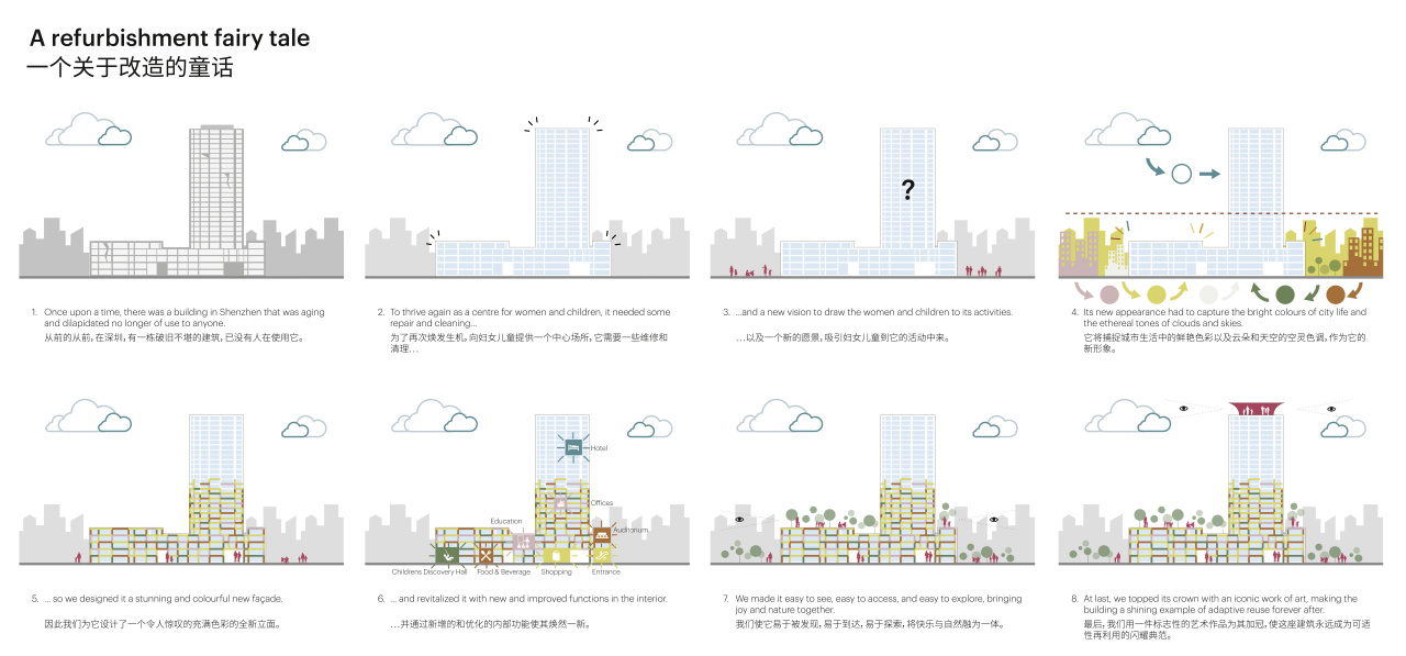 MVRDV创始合伙人Jacob van Rijs表示:“深圳妇女儿童大厦可以成为深圳的一个开创性项目。随着城市的快速发展,现在有很多建筑在设计之初并没有真正考虑到较长的使用寿命。这在未来可能会导致大规模的拆除,或者,更加理想的状况下,会引发一波适应性再利用的浪潮。这个项目证明,即便是不够合理或者已经落后的结构,也能够进行重复使用,这样可以节省大量的混凝土,并减少数百万吨的碳排放。”