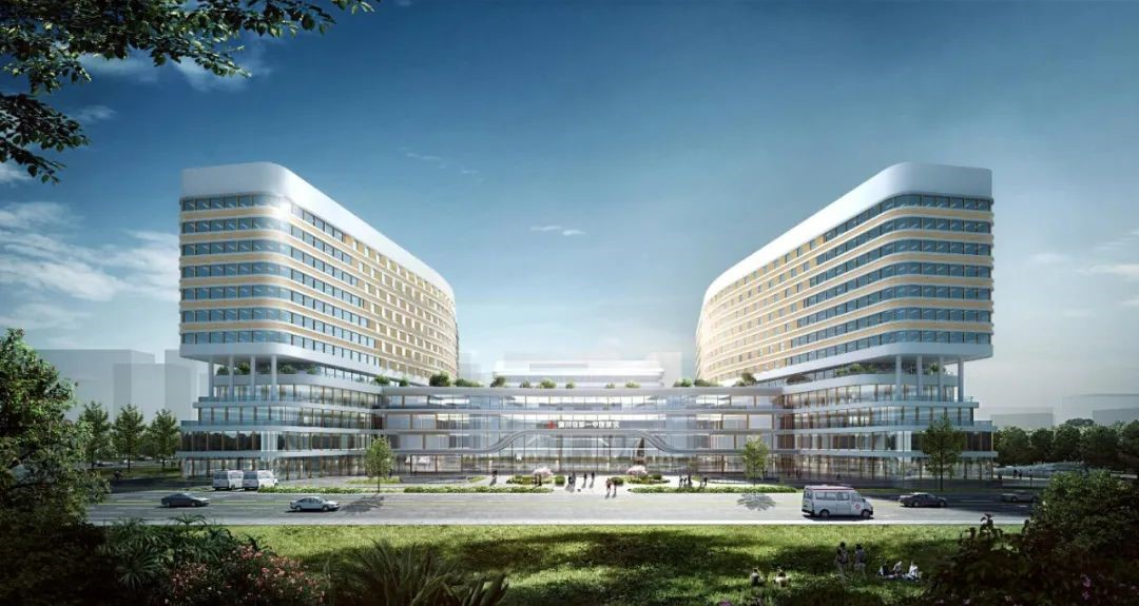 从空中俯瞰项目,建筑呈两边高中间低的形态,像字母“H”。医院外立面形象融入了传统中医“药柜”元素,室内则将国画山水意境与空间结合,营造具有中医文化元素的沉浸式空间,满足功能的前提下,打造出浓厚的中医文化氛围。