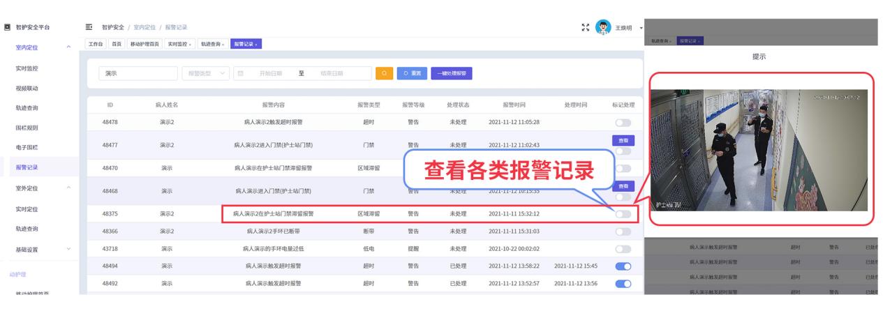 以电子围栏划定限制区域,病人佩戴定位手环出入即报警,可在后台查看各类报警记录及门禁区域抓拍的高清照片,方便及时到场处理。