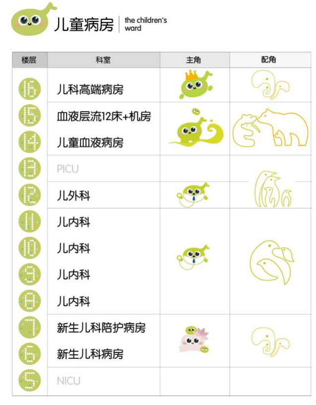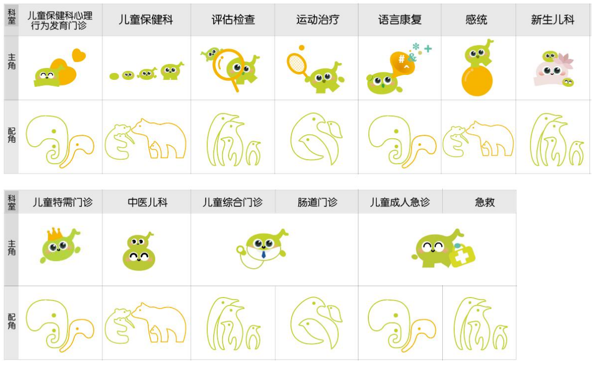 门诊楼医技楼IP手持与科室功能相关的道具,结合图形,成为功能空间的导医,以及医院文化的传播者。