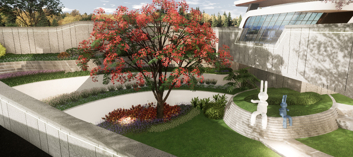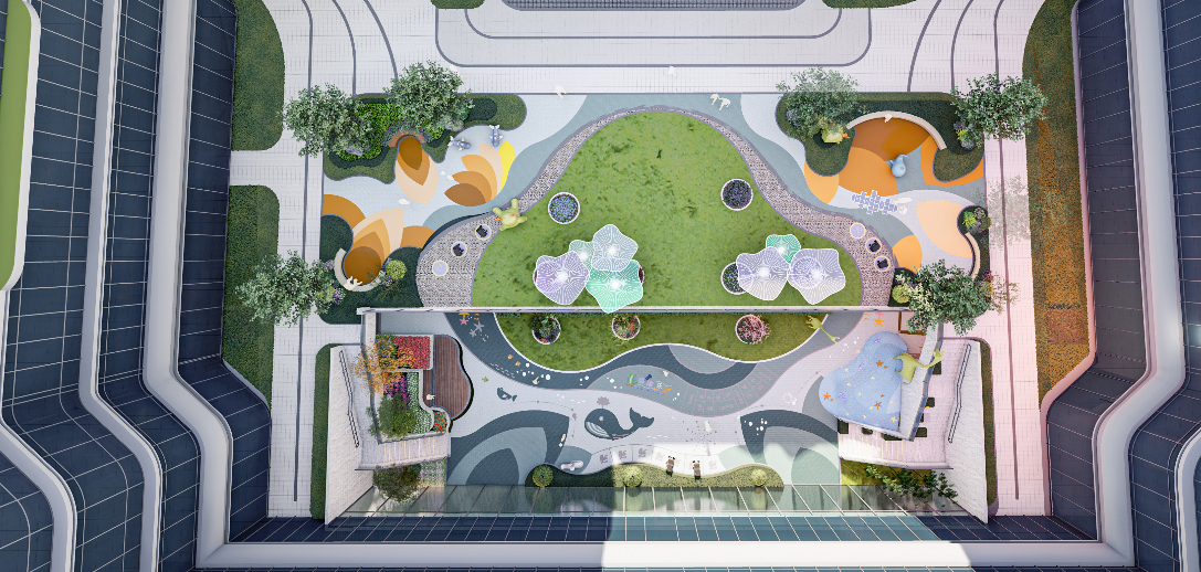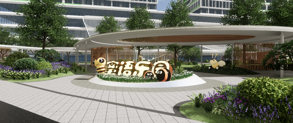 蜜语乐园区位于住院大楼北侧入口广场处,用弧形的景观连廊,将广场自然地切分成3个休闲空间,分别为:儿童游乐区、草坪休息区、沿路景观区。这三个区域,虽形态各异,却和谐共生,共同编织出一幅幅生动而富有层次感的画面,不仅丰富了广场的功能性,更提升了空间的趣味性与观赏性,使得蜜语乐园区成为了一个集休闲、娱乐、观赏于一体的综合性乐园,让每一位踏入其中的人都能找到属于自己的那份快乐与宁静。