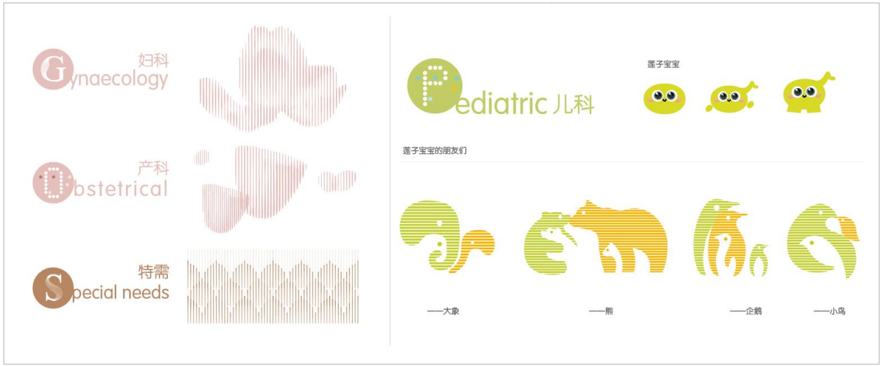 延续建筑“莲花”、IP“莲子宝宝”的概念。莲花和莲子,为莲全生命周期最美好、最生机勃勃的两个阶段,所以在图形体系设计上,将妇科设计为莲花、产科为莲蓬、特需为宝莲花纹、儿科为莲子及它的朋友们;形象设计上,以“家庭”为背景,讲述莲子从孕育出生、莲花绽放、花又生子的全生命周期的美好故事。