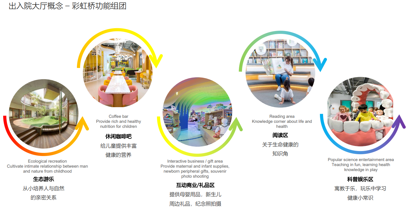 彩虹是自然界最具代表性的元素之一,大多数小朋友对色彩和形状的认知是从彩虹开始的,将彩虹概念融入到医疗空间使儿童从心理层面上快速进入舒适圈。