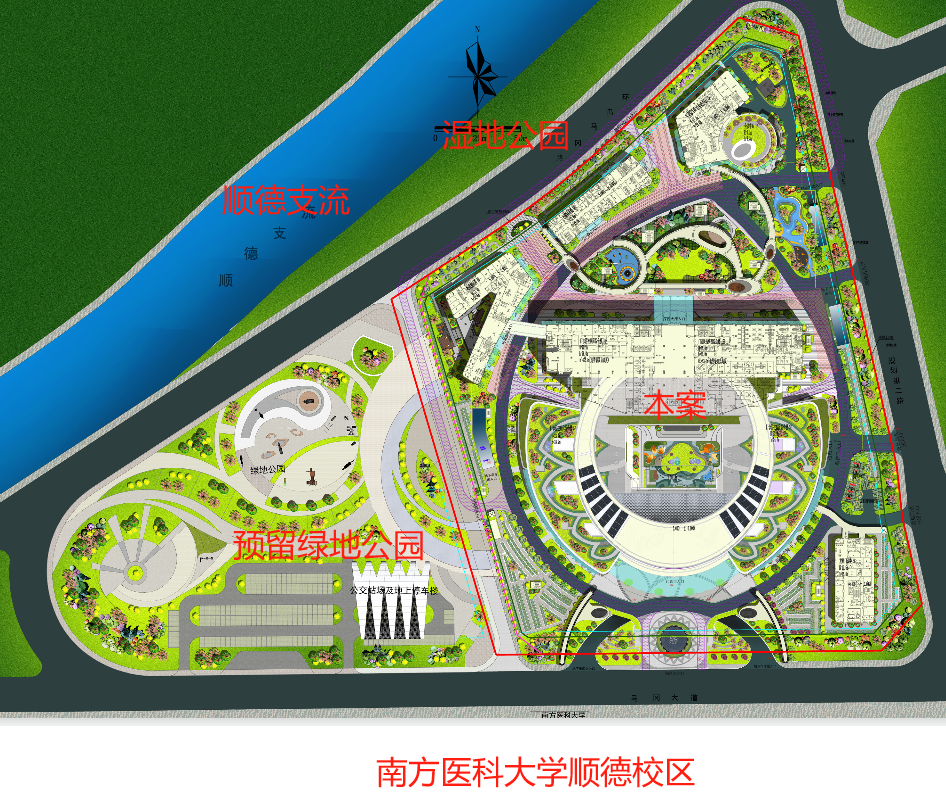 该项目位于马冈大道之北,顺德支流以南;其西侧,为一片规划预留绿地公园,为院区勾勒出宁静致远的自然边界;北侧紧邻顺德支流河涌湿地公园,水岸风光旖旎,赋予了项目得天独厚的生态韵味;而南面,则是学术氛围浓厚的南方医科大学顺德校区,知识之光与医疗之善在此交相辉映,不仅彰显了区域教育与医疗资源的深度融合,更为新院区平添了几分人文气息与智慧光辉。如此优越的地理位置,加之四周环绕的丰富自然景观与教育资源,无疑为顺德妇幼马冈新院区项目披上了一层璀璨的光环,使得其在规划之初便已注定将成为融合自然美景、先进医疗与高等学府智慧于一体的现代化医疗地标。