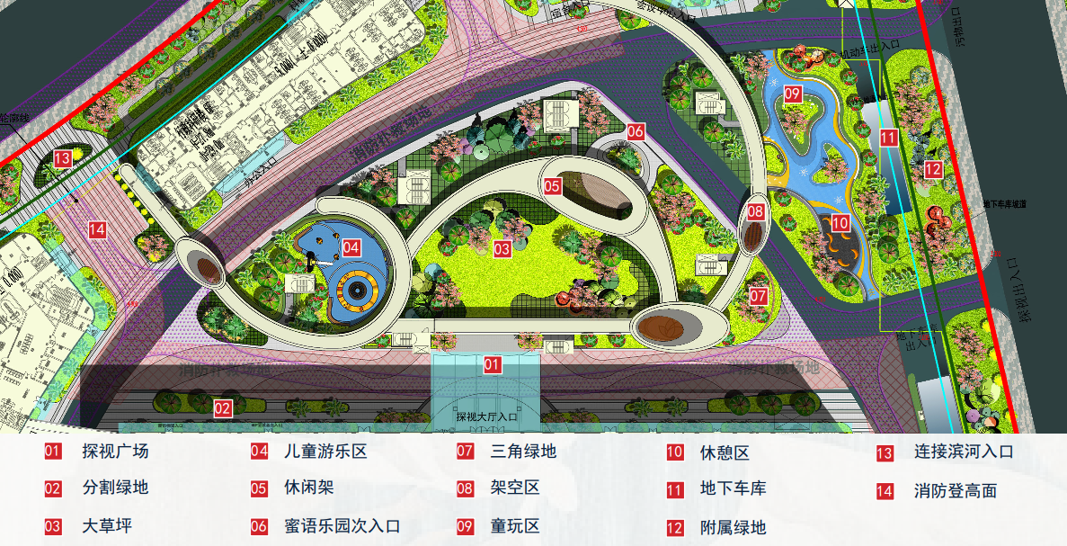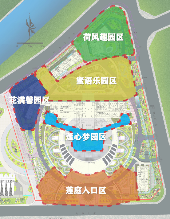 该项目景观规划分为地块周边景观资源规划及地块内部景观规划。地块周边景观资源有:预留绿地公园、沿河湿地公园、大学校园风光;地块内部分为:莲庭入口区、莲心梦园区、蜜语乐园区、花满馨园区、荷风趣园区。