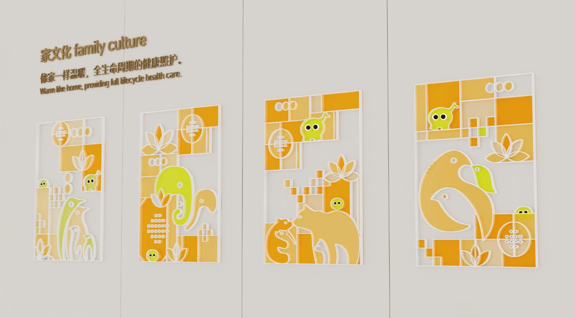 医院的环境空间非常大,形式可相对丰富。将体现家文化的画廊,点缀在医院的休闲、走廊等空间。