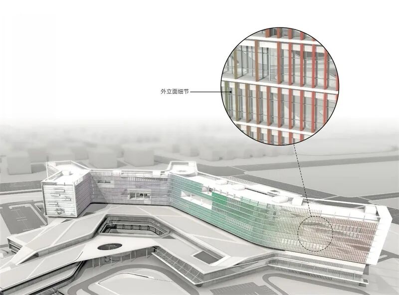 立面细节:为了有效避免夏季强烈日光直接照射医院窗户,建筑外立面设置了竖向遮阳系统,遮阳系统主要由穿孔金属遮阳板组成,遮阳板经过双面彩色喷涂,每个面的色彩都能有微妙的变化(渐变色)。