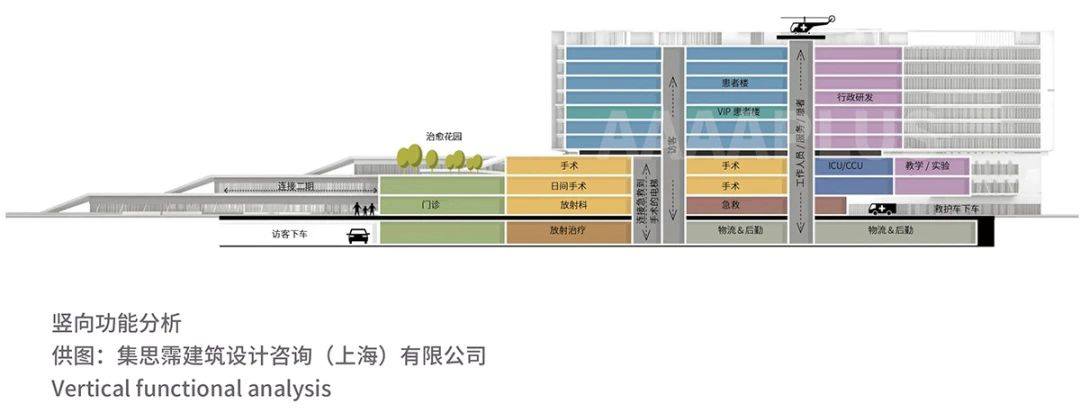 全院围绕临床学科的特色和规划,以病种为基础,结合功能的模块化布局,打造十大诊疗中心。集成化设计打破传统医疗功能平行布局的逻辑,采用临床诊疗中心模式,将同一病种的相关功能,如内外科、专科医技、采样等集成在一起,共享会诊和生活用房。