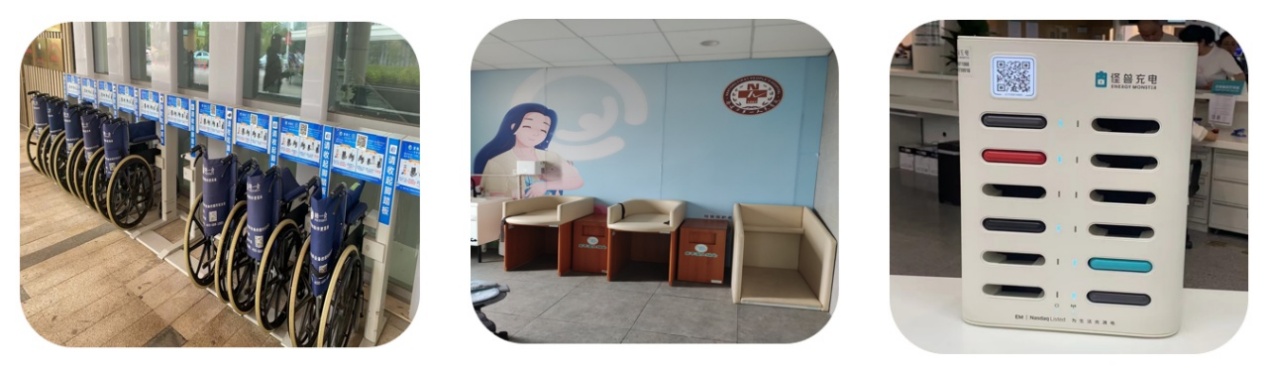基础便民设施:运营后持续提升服务能级,增设共享充电宝、纸巾机、快递柜、爱心母婴室、共享轮椅、自助售货机、第三卫生间等多元便民措施,深化医疗人文环境内涵。