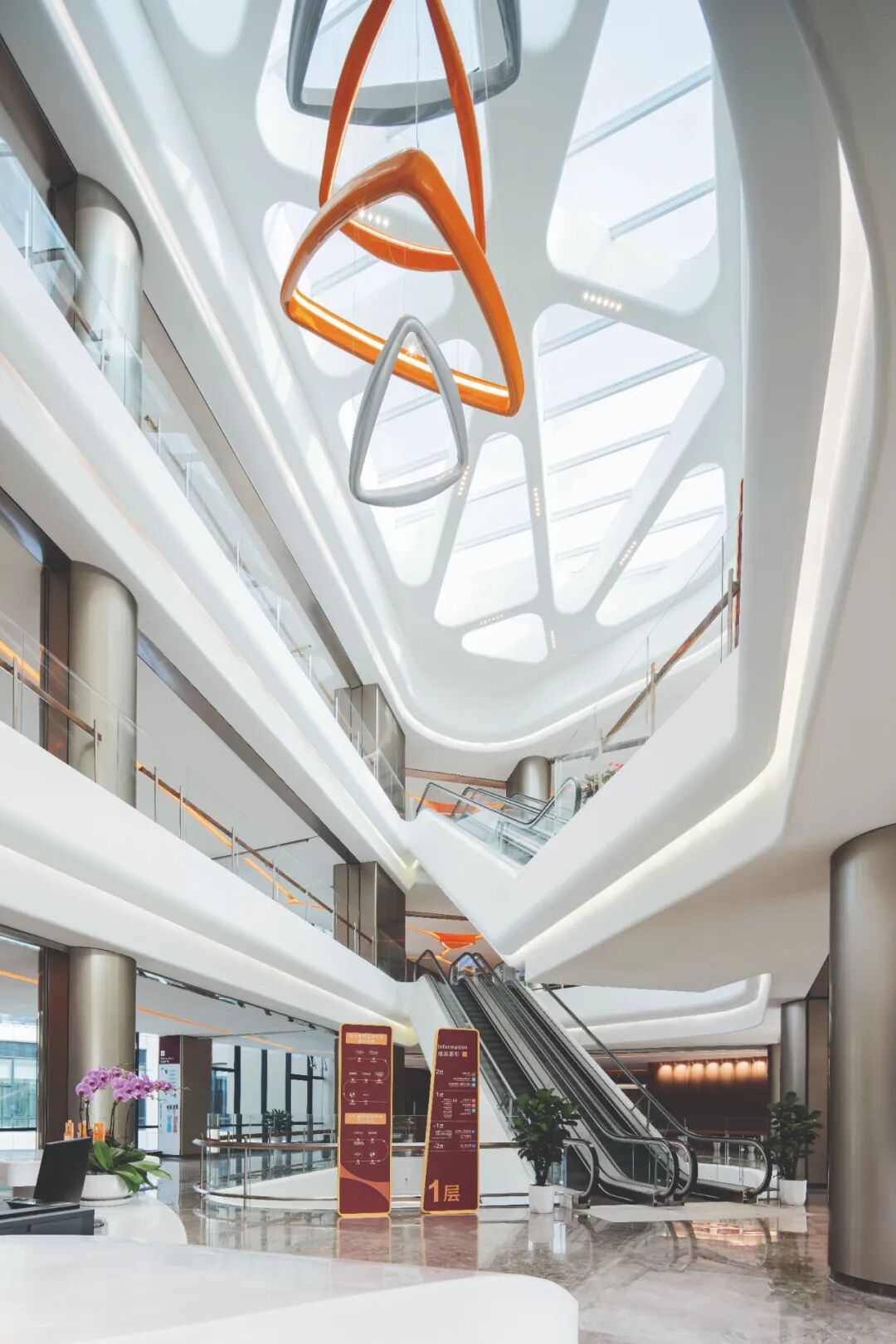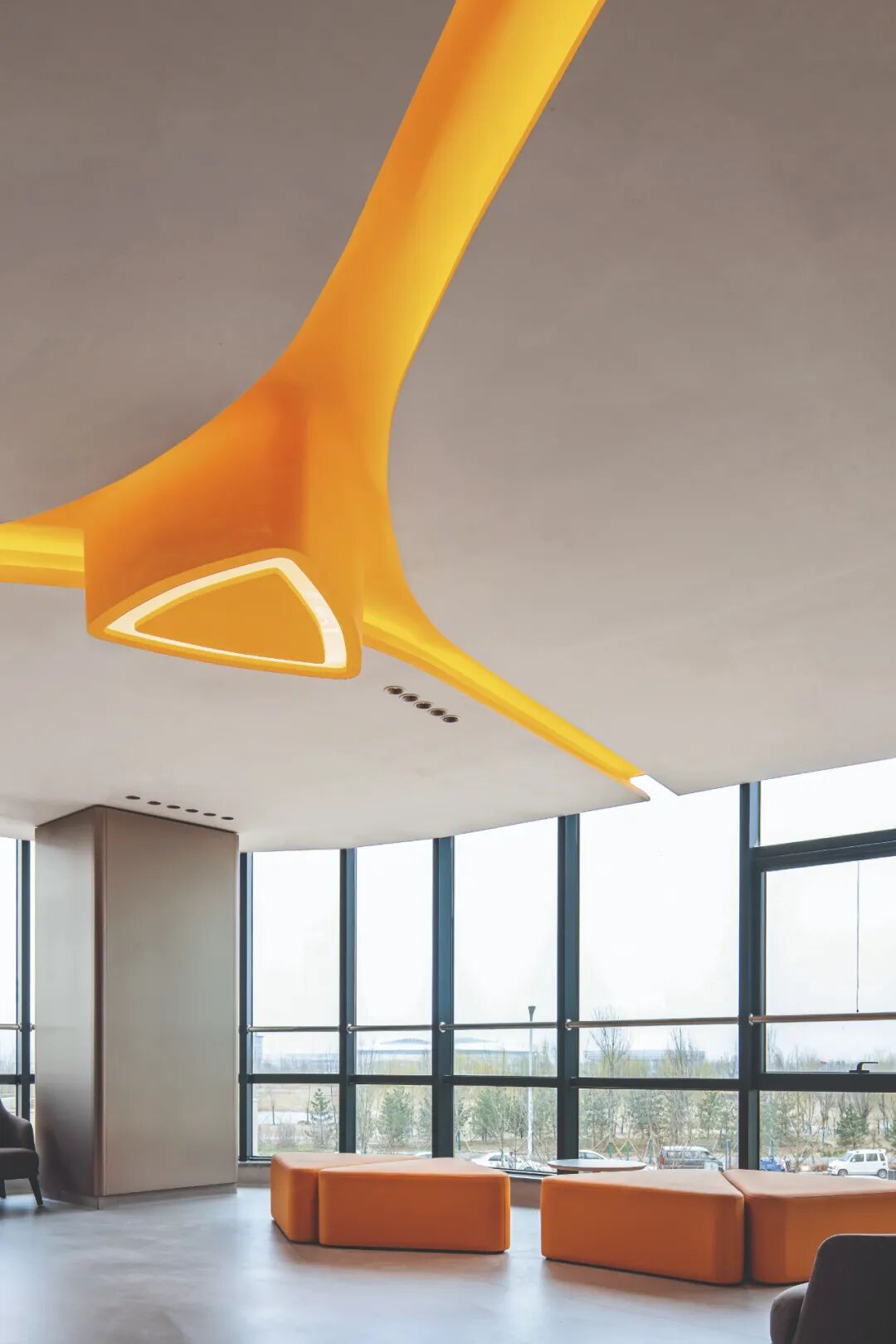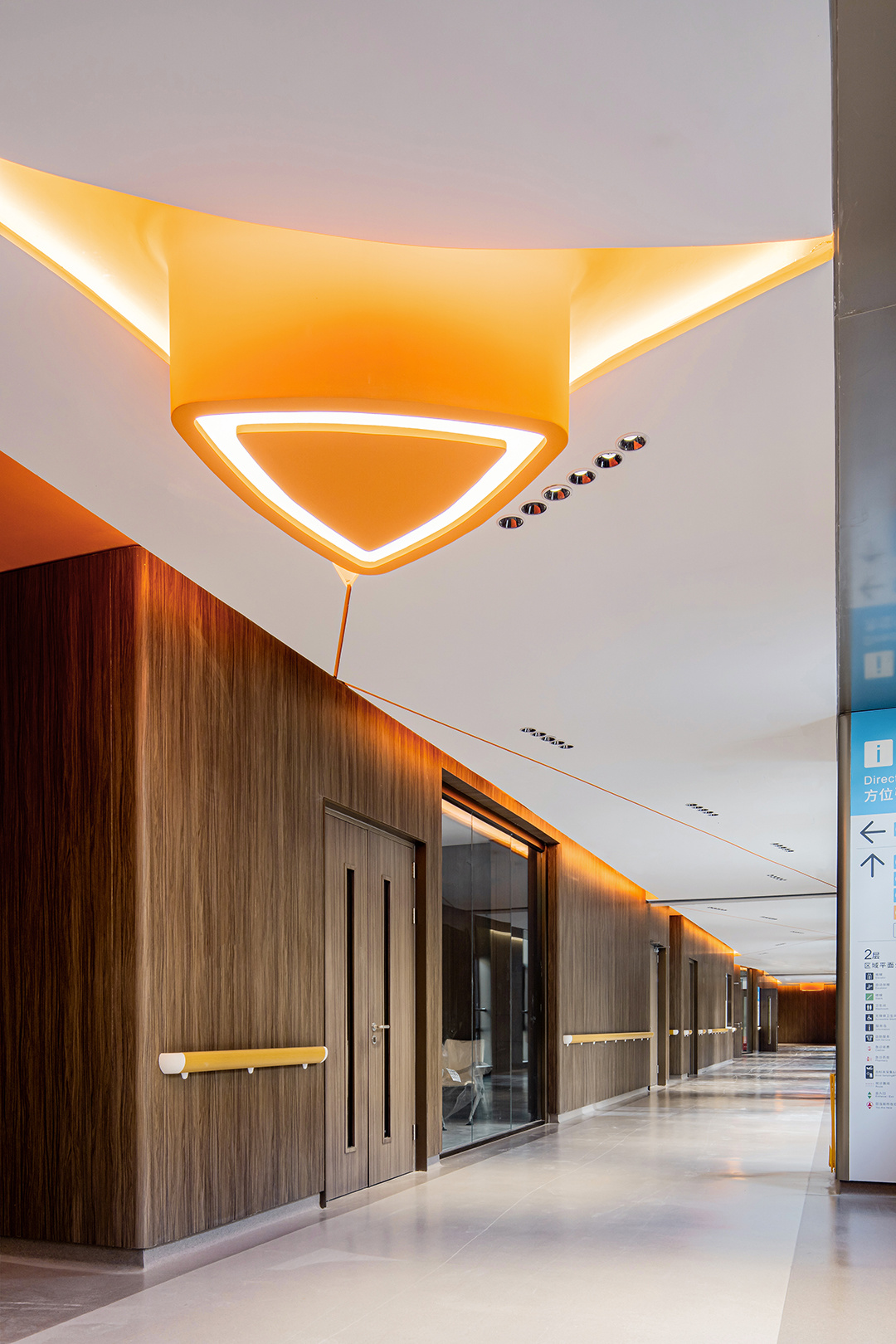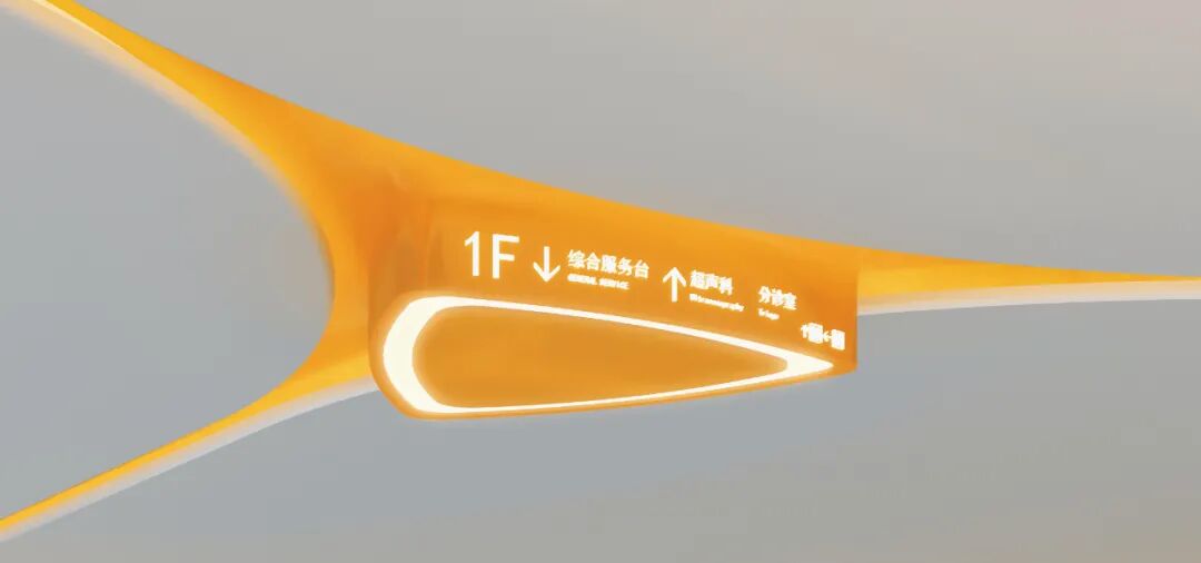 橙色三角环形灯具在医院的各个角落闪耀着独特的光芒。它们造型独特,既像一个个连接着生命信息的神经元,又像守护着患者的温暖光环。