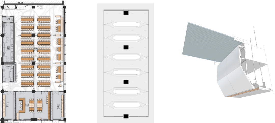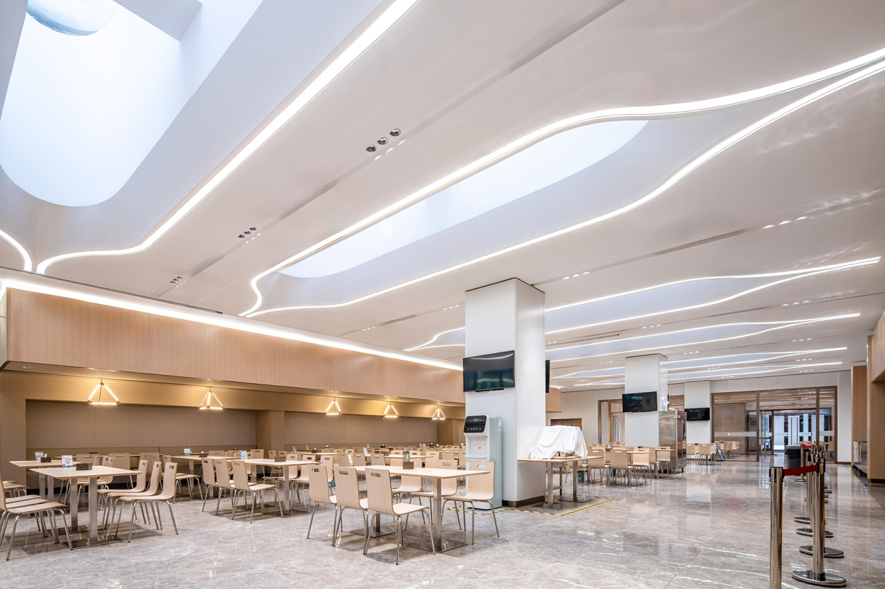 地下一层员工食堂以橙色灯光与原木餐桌营造温馨用餐环境,设置包间与快餐厅分区,满足不同用餐需求。