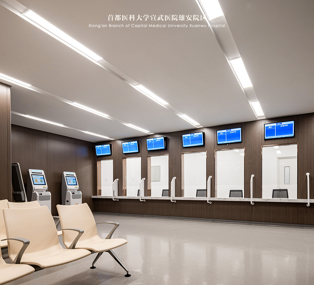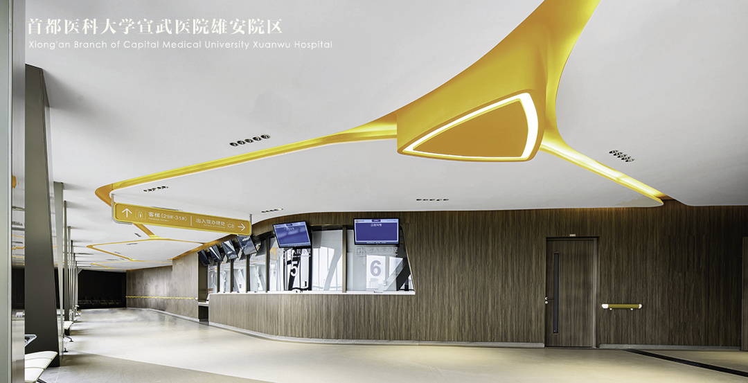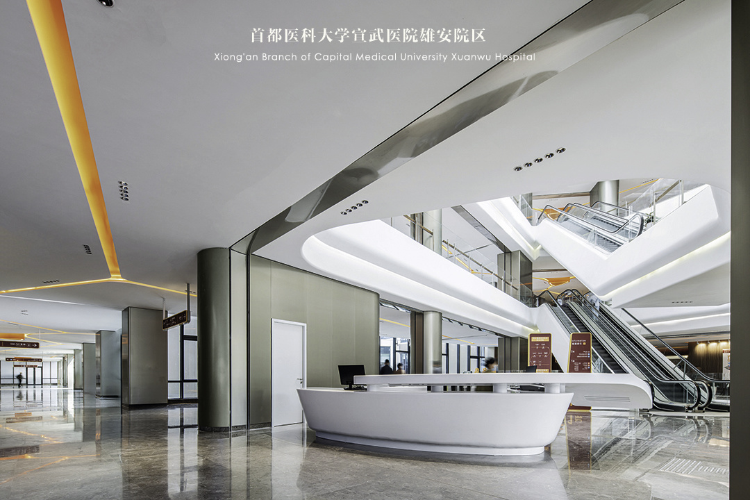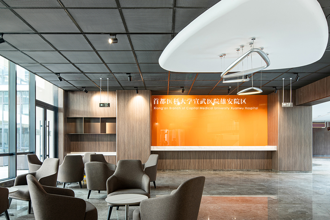 首都医科大学宣武医院雄安院区室内设计通过以人为本的空间设计、酒店式空间体验、商业化与综合型医疗形式的结合,创造了一个安全、舒适、放松的就医环境。佰地设计旨在传承医院的精神形象,在建立积极向上的文化理念的同时承载健康希望、无限未来和社会责任。