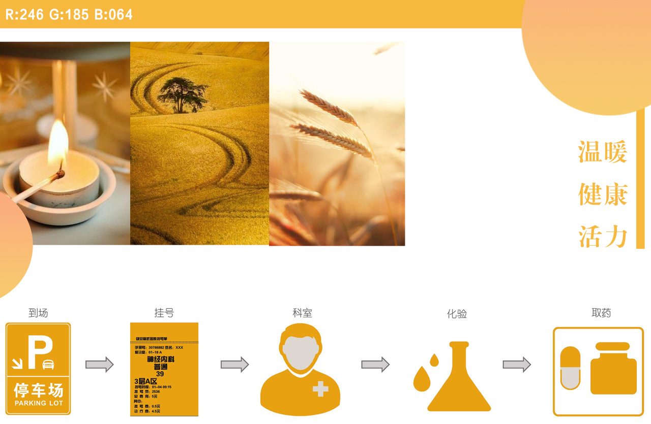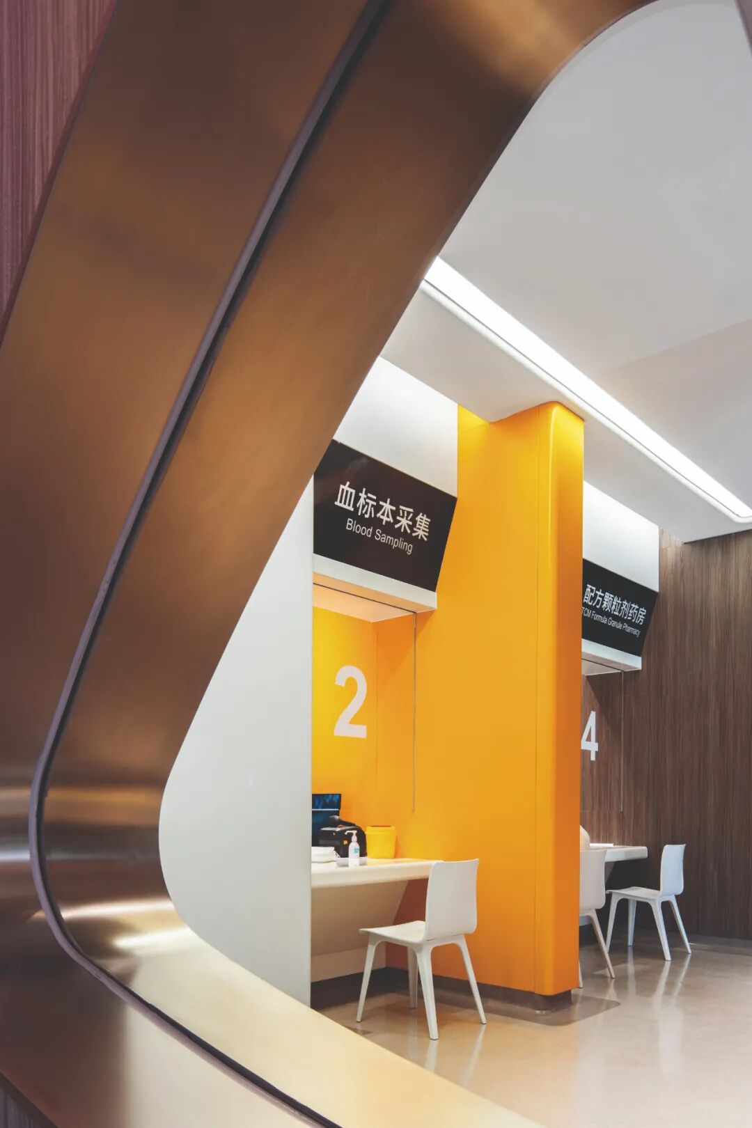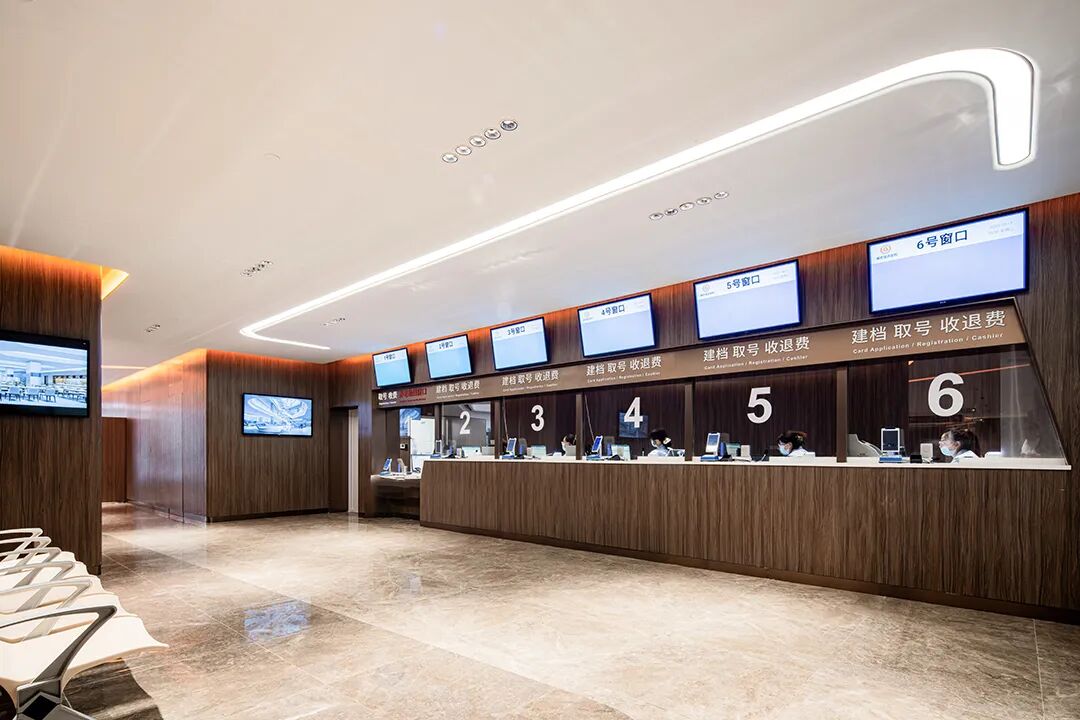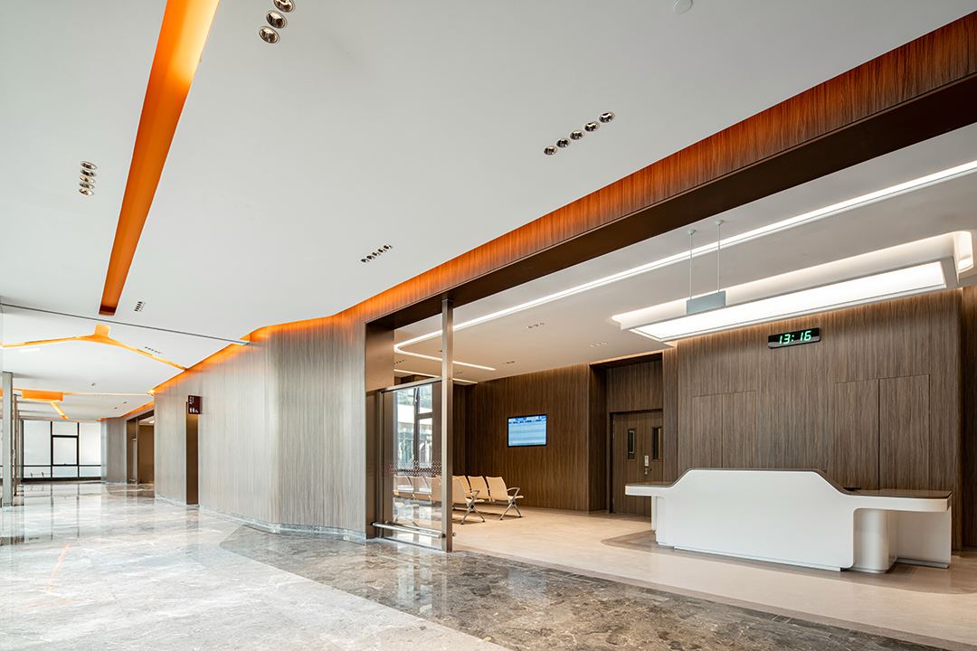 发药区与检验区墙面采用木饰面与局部橙色玻璃贴面传递活力与希望。设置开放式导诊台与智能导航屏,结合酒店式服务理念,简化流程。
