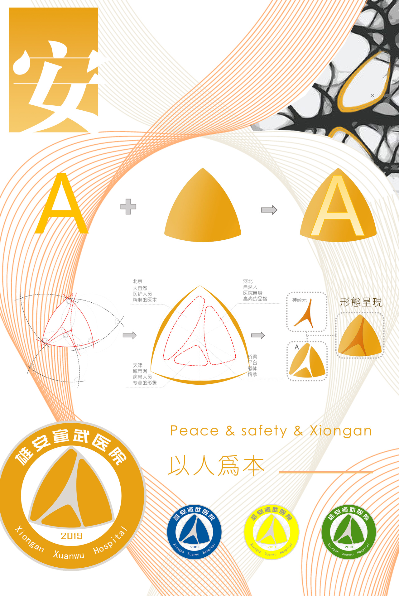 基于整套室内设计理念,项目团队为雄安宣武医院打造了独特的VI系统。该系统以雄安的“安”为核心主题,延伸传递平安、安全的理念。设计中融入了神经元的圆角三角元素,既体现了医院在神经医学领域的专业性,也寓意着医院能像神经元传递信息般,为患者提供精准高效的医疗服务。系统全面结合中英双语与盲文标识,充分展现了国际化视野与无障碍关怀。