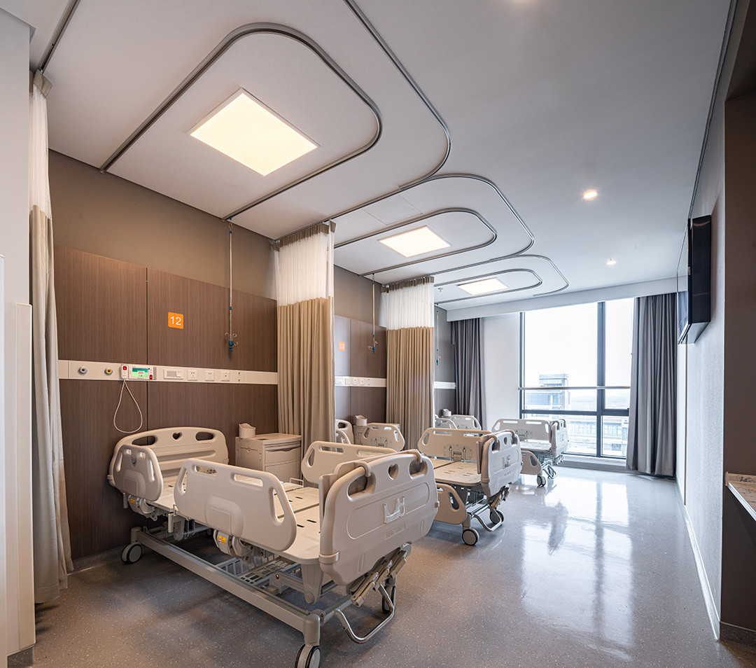 住院楼设计采用酒店式空间形式,提供安全、舒适、放松的空间感受,减少传统医院中冰冷、嘈杂、缺乏安全感的负面体验。