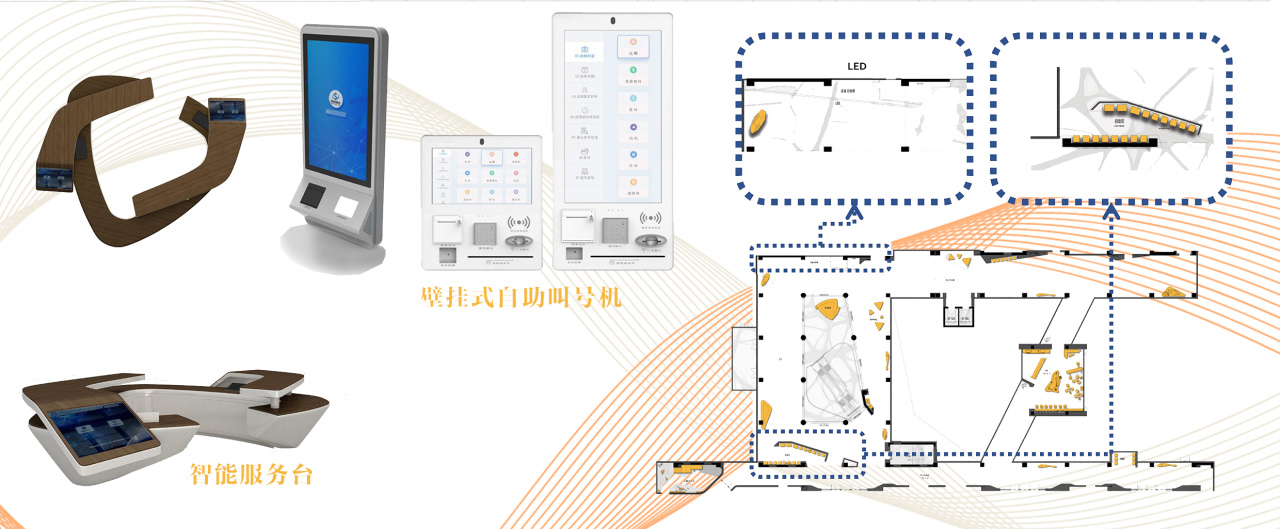 自助终端机嵌入VI系统设计的“安”字标识界面,操作流程简洁直观。环廊增设充电站与饮水设备,提升便利性。环廊边缘设置自助贩卖机与水吧,满足患者及家属临时需求,弱化传统医院的冰冷感。