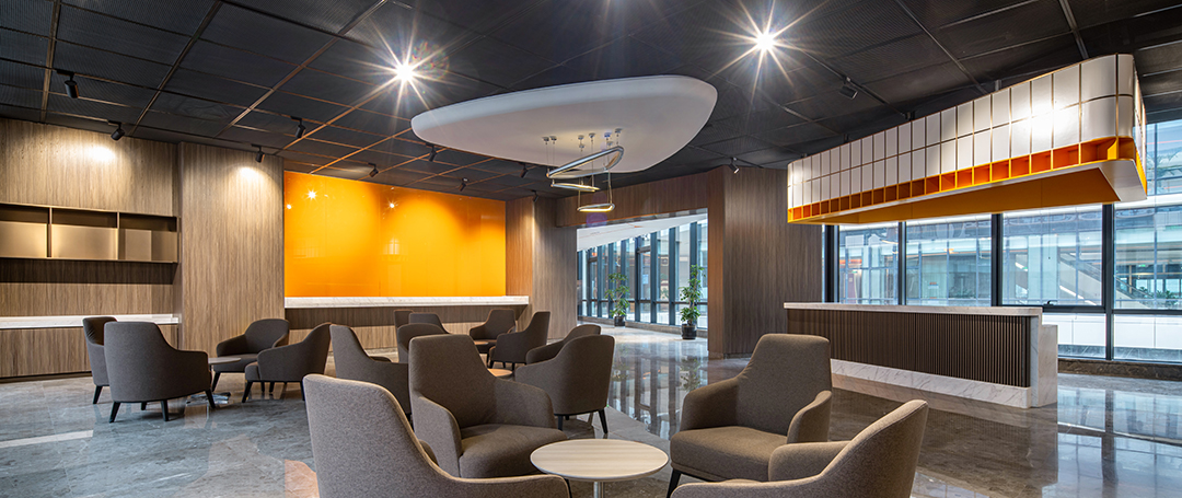 步入门诊大厅,吊顶造型充满了神经元学科元素,延续宣武医院神经科学和老年医学的特色。结合天花橙色镂空隔断自然光线与柔和的间接照明,营造温暖、明亮的接待环境。