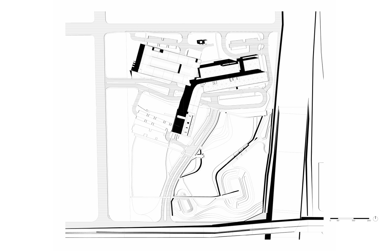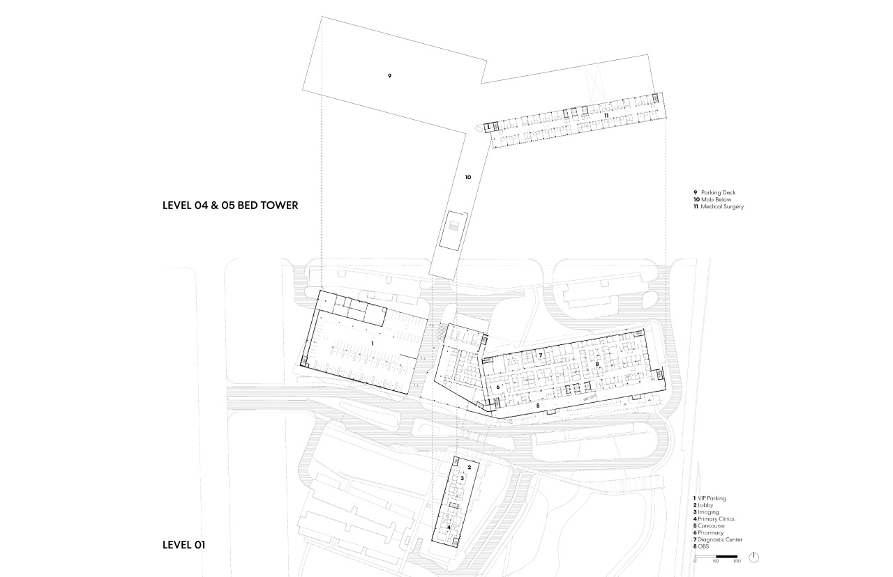 6层高的医院设施拥有98张床位,其中外科病床84张,ICU病床8张,产科病床6张。诊疗区包括急诊科、影像服务、介入平台、实验室、药房等功能空间。新院区还具有一个可移动的综合医疗诊所/医疗办公大楼和一个新的配套设施大楼,其中包括结构化停车场、中央设备间、装载区、材料管理和维护服务。